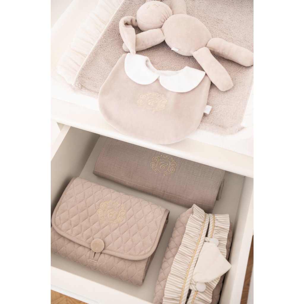 Náhradný poťah na prekrytie prebaľovacej podložky. Vyrobený z bielej froté bavlny so zlatým znakom, rozkošným riasením v béžovej farbe so zlatým lemom.