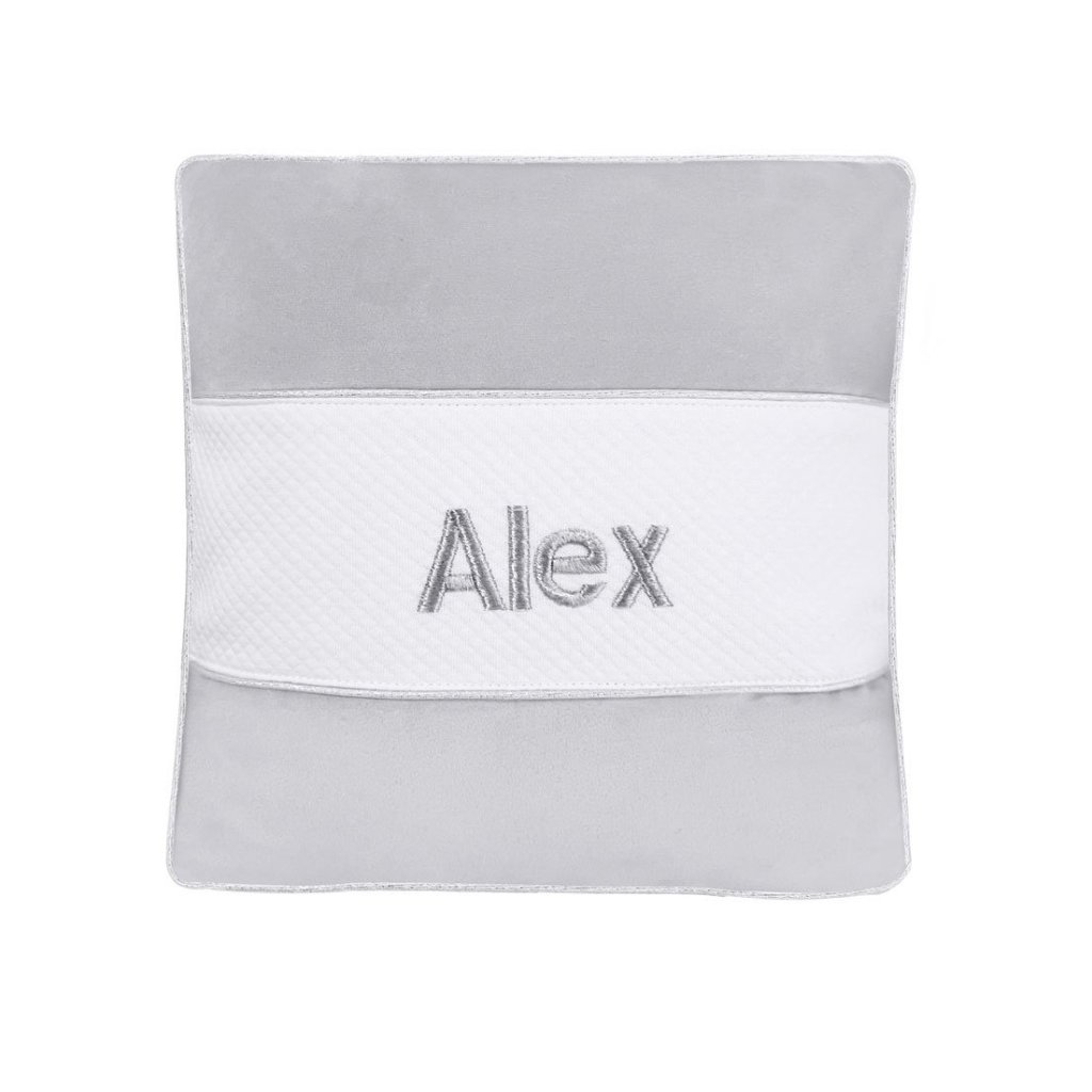 Rozkošný vankúšik z jemného bledošedého velúru. Zdobený elegantnou výšivkou s menom Vášho dieťatka. Súčasťou vankúšika je obliečka na vankúš s výplňou. Dostupný v dvoch veľkostiach. Meno dieťaťa napíšte do poznámky pri finalizovaní objednávky.