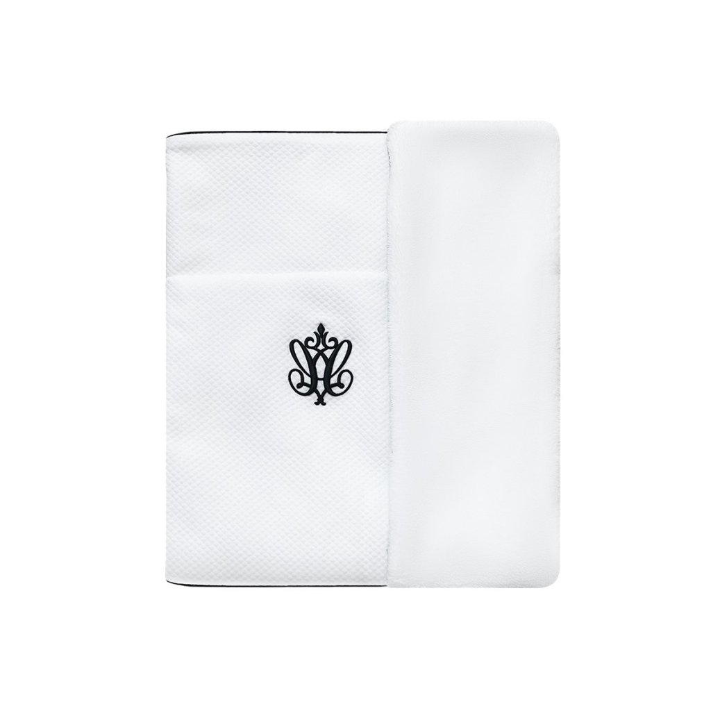 Elegantná obojstranná velúrová deka - biela s tmavomodrým elegantným znakom. Bude skvelým doplnkom výbavičky pre chlapčeka a dobrým nápadom na darček pre dieťa.