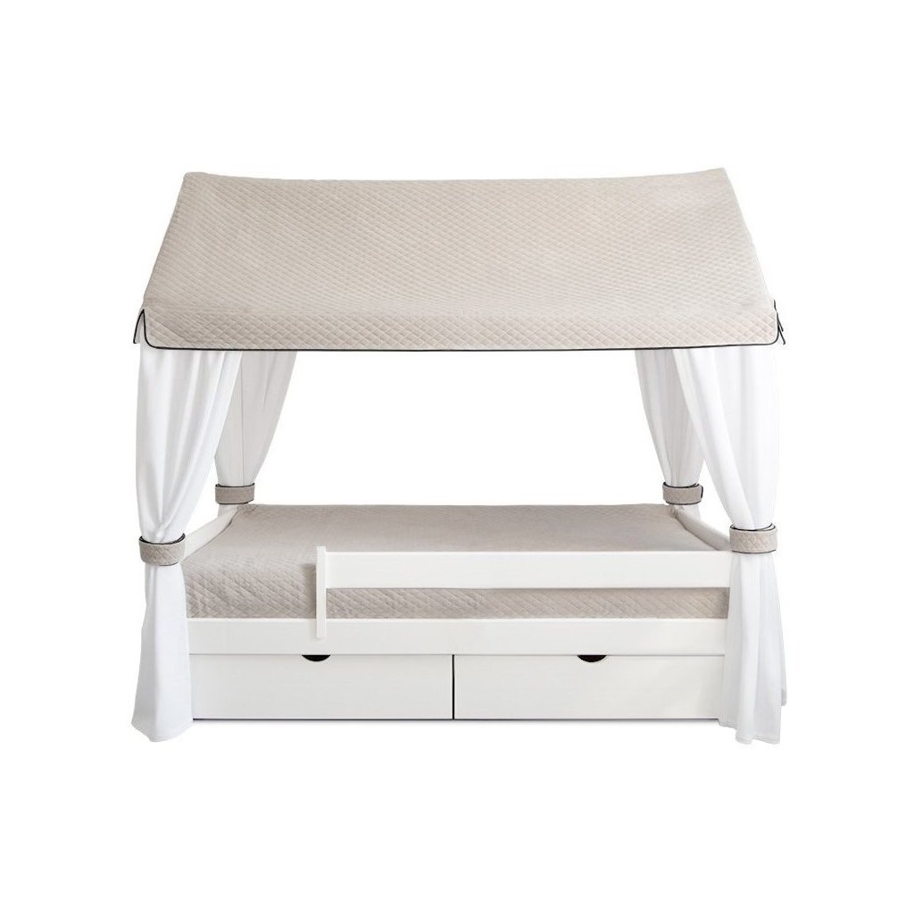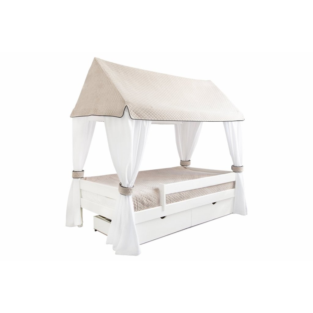 Úžasná posteľ v tvare domčeka. Posteľ vytvorí v izbe jedinečnú atmosféru. Strieška je vyrobená z béžového prešívaného bavlneného materiálu a „steny“ sú vyrobené z jemného bieleho textilu, zdobeného dvoma očarujúcimi mašličkami. Rozmer matraca 160 x 80 cm.