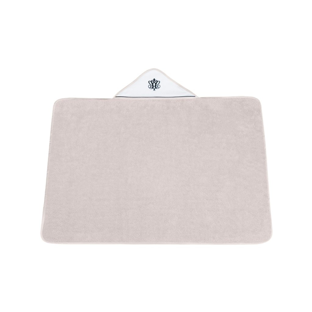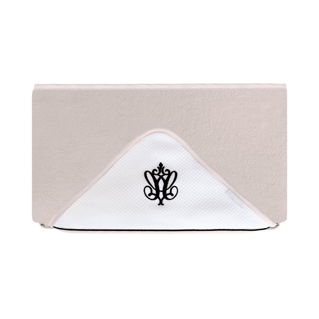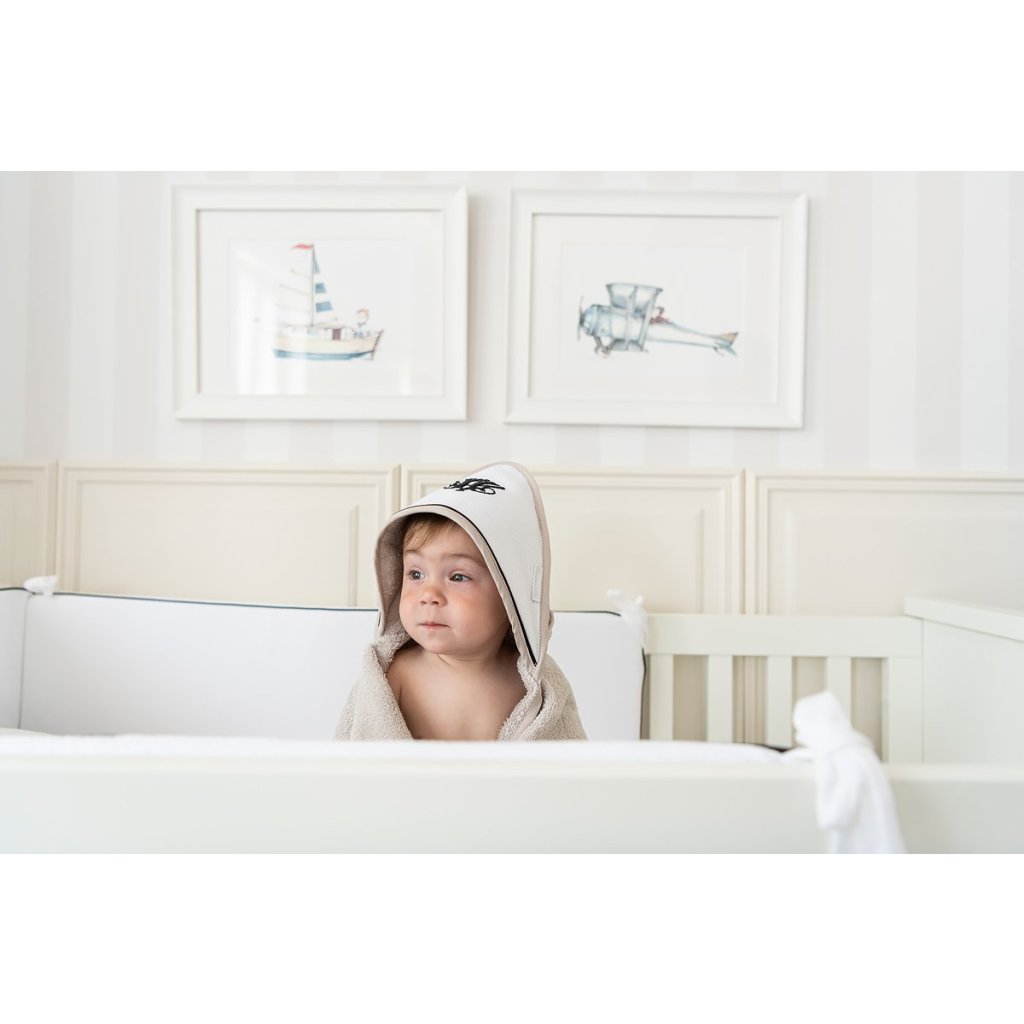 Elegantná osuška vyrobená z béžovej froté látky. Biela froté čiapka je zdobená čiernou výšivkou a lemovkou. Veľkosť osušky je väčšia, než je bežne dostupné na trhu. Osušku tak môže používať malé aj staršie dieťa. Preto ju budete používať veľmi dlho. Ideálna ako darček.
