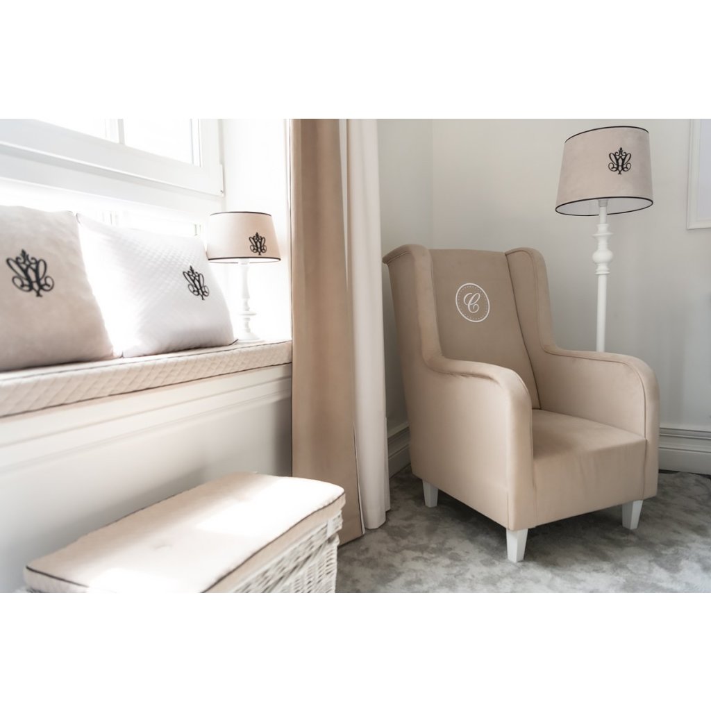 Veľké a veľmi pohodlné moderné kreslo potiahnuté kvalitným umývateľným materiálom v béžovej farbe. Kreslo je zdobené elegantnou bielou dekoráciou a exkluzívnym znakom s písmenom „C“ v bielej farbe. Toto kreslo ocení každá dojčiaca mamička vzhľadom na vysoké opierky na hlavu a lakťové opierky. Kreslo zapadá do každého interiéru - detskej izby, obývacej izby, spálne a ďalších.