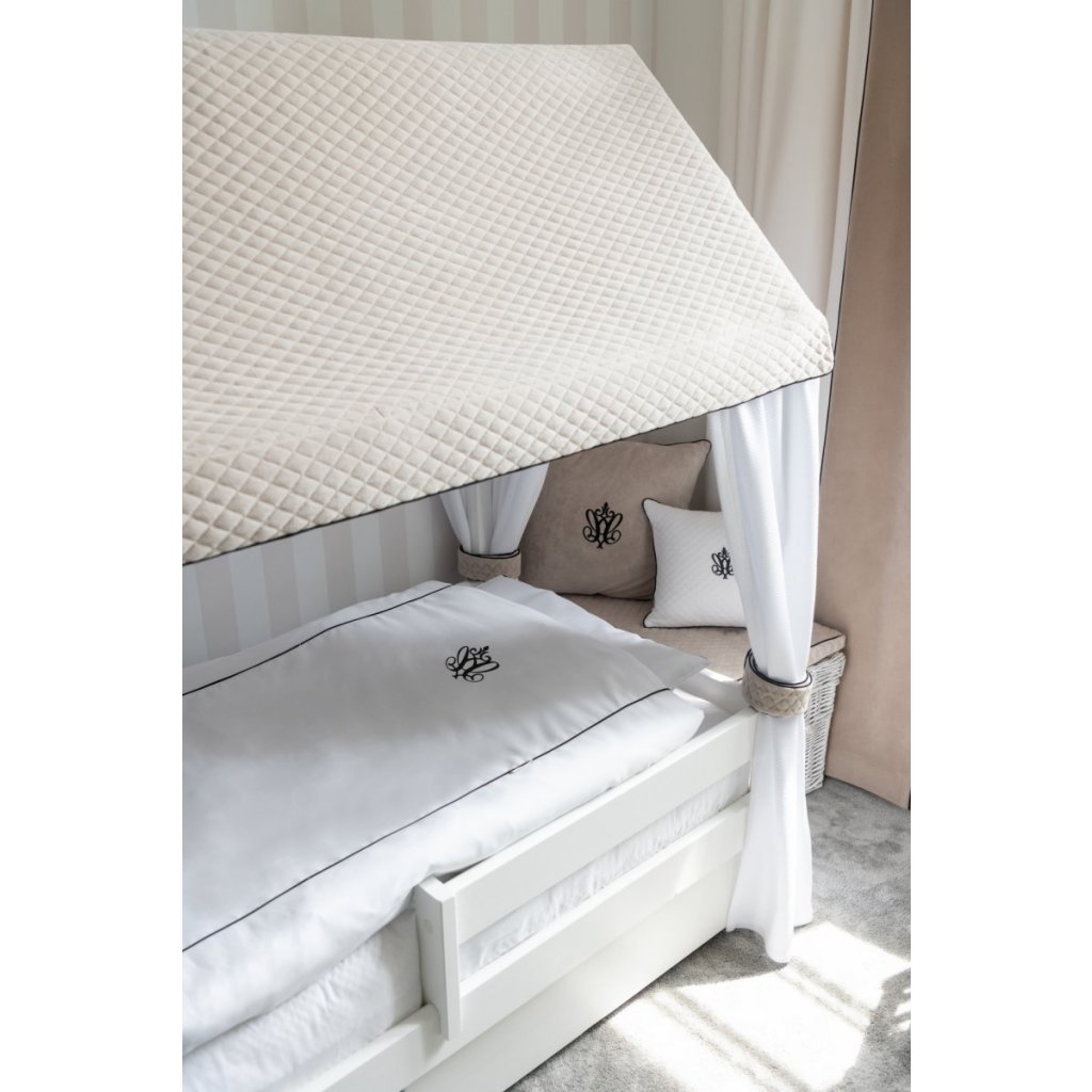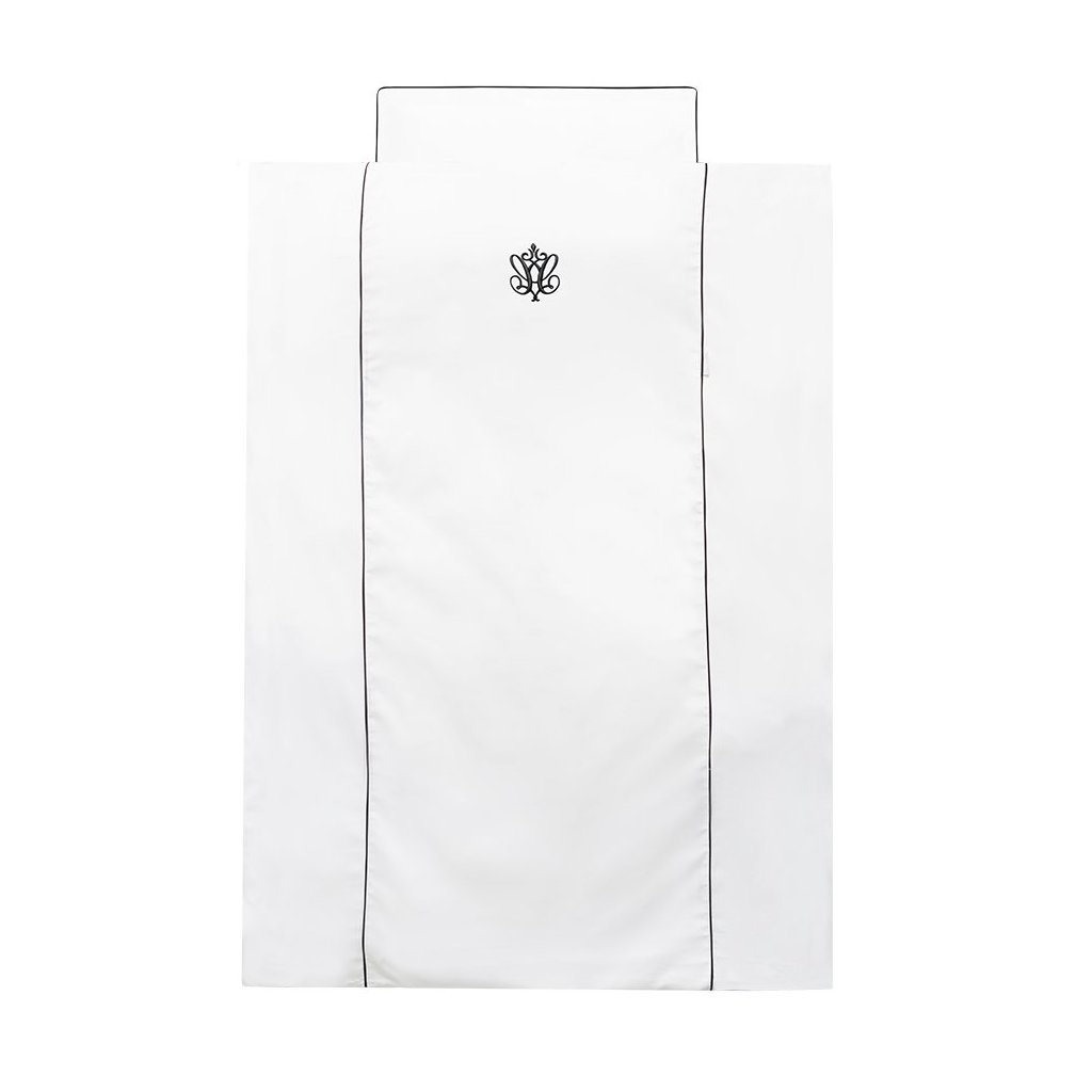 Krásne obliečky z bielej farby zdobené s čiernou lemovkou. Hladká bavlna bola kombinovaná, zdobená elegantnou trojrozmernou čiernou výšivkou a vsadkou. Verzia pre batoľa, ideálna do postieľky Dream a postieľky Modern Classic.