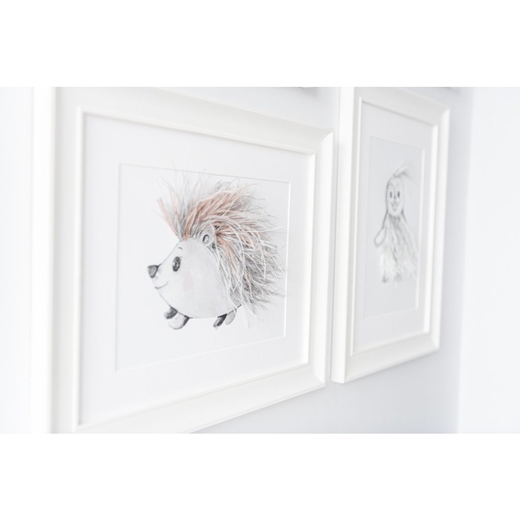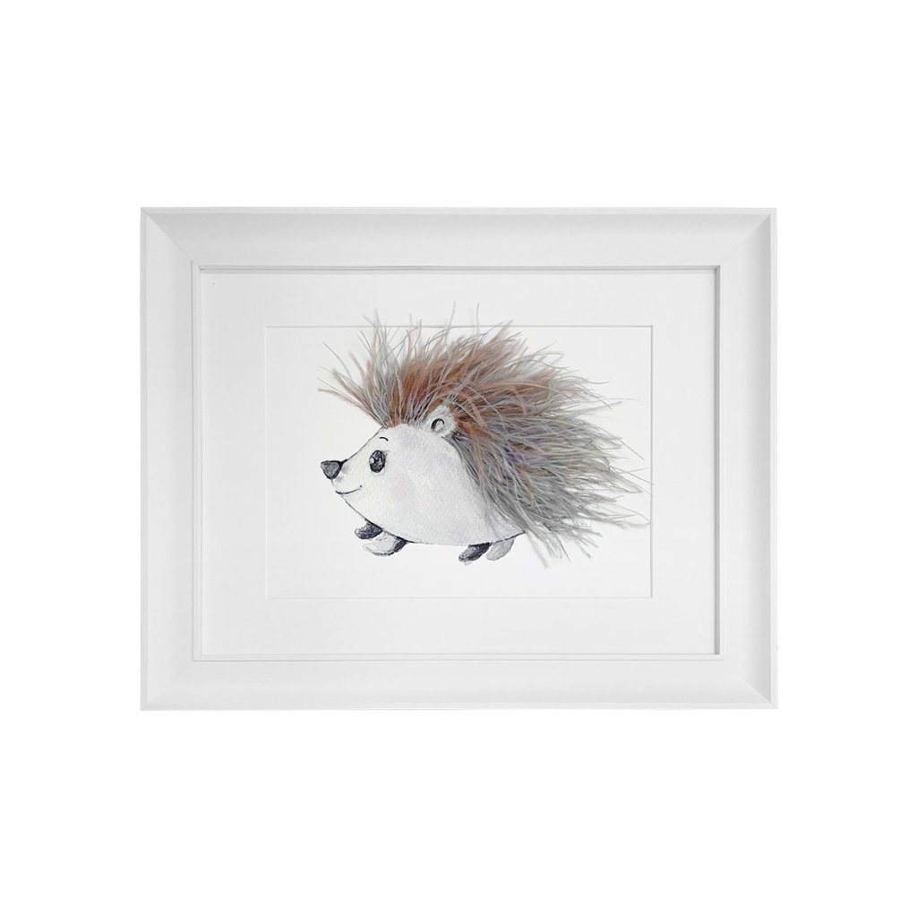 Krásny trojrozmerný textilný obrázok s motívom ježka, dotvorený prírodnými pierkami. Krásna a originálna dekorácia do detskej izby. Zvýraznený dreveným bielym rámom.