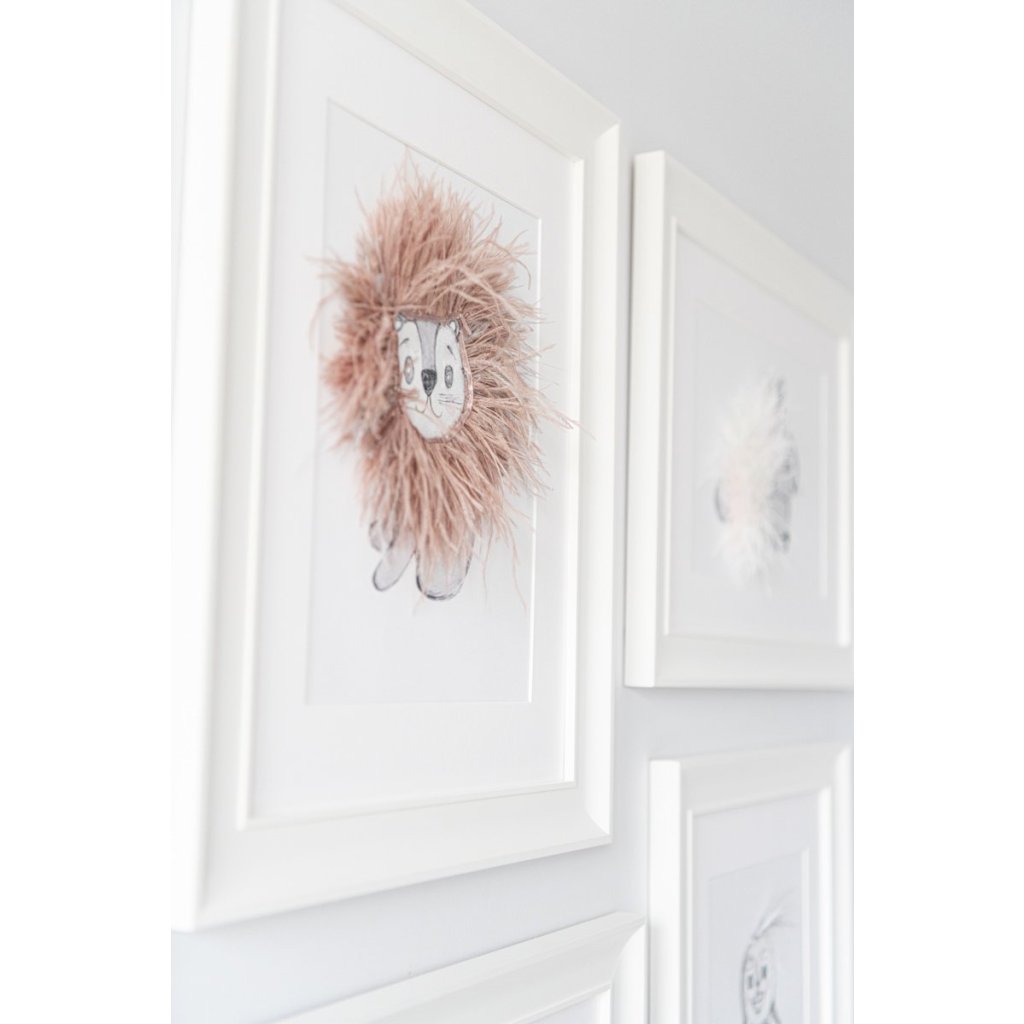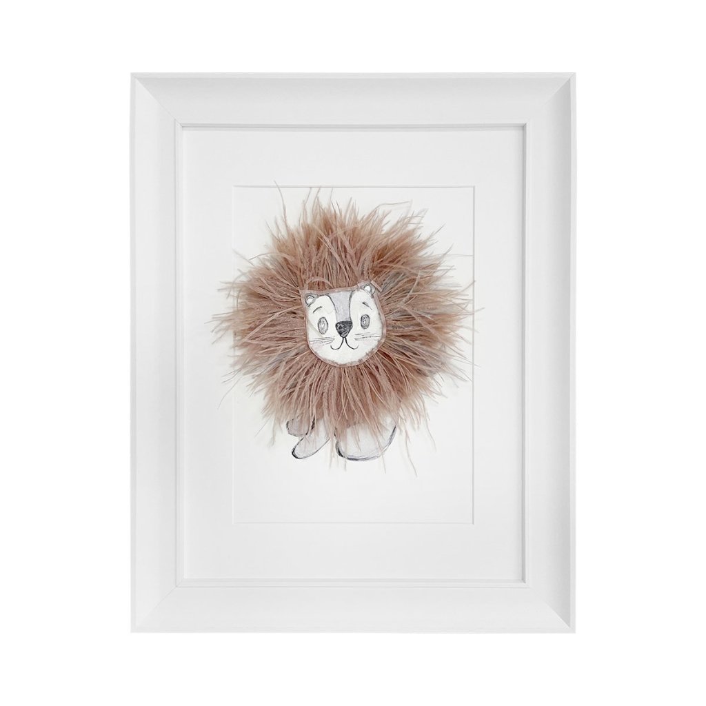 Krásny trojrozmerný textilný obrázok s motívom lev, dotvorený prírodnými pierkami. Krásna a originálna dekorácia do detskej izby. Zvýraznený dreveným bielym rámom.
