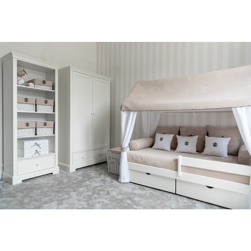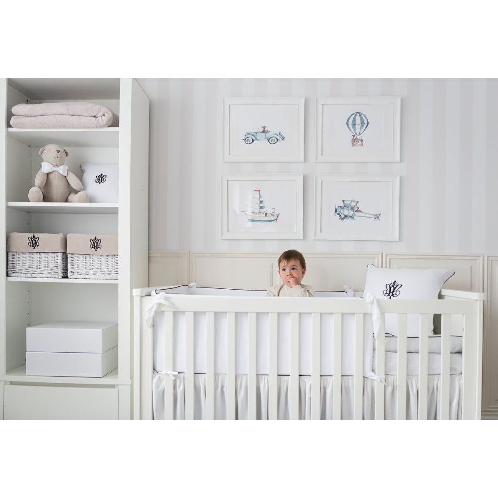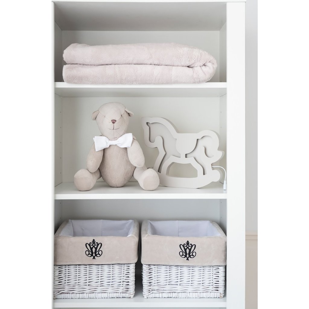 Elegantný prútený košík s béžovým velúrovým poťahom s čiernym emblémom a lemovkou z košíka robí nielen užitočnú vec na uskladnenie, ale aj krásnu dekoráciu. Ideálne miesto na uloženie hračiek, plienok alebo iných doplnkov pre deti.