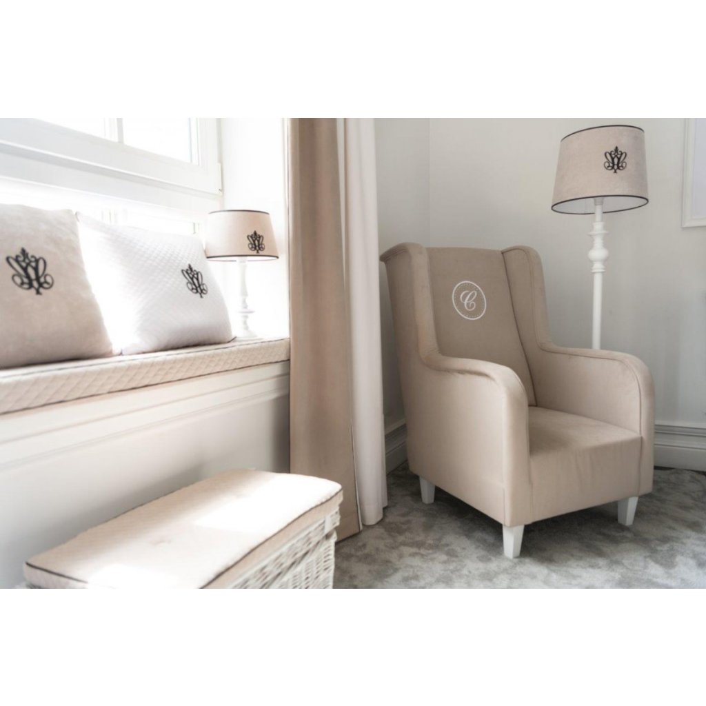 Krásny dizajn pre dievčatá. Stojacia lampa z béžového velúru. Zdobené čiernou ozdobnou páskou a výšivkou. Veľká izbová lampa s elegantnou drevenou nohou. Dokonalé svetlo do každej detskej izby. Táto lampa je ručne vyrábaná a medzi ramenami a hlavným prvkom sú viditeľné spojenia. Vďaka ručnej výrobe je každá lampa jedinečným výrobkom a môže sa od seba líšiť.