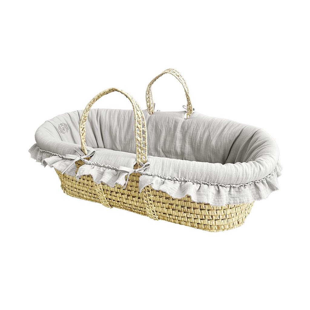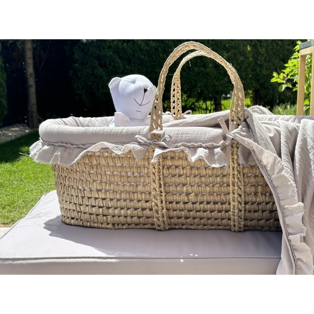 Rozkošný kôš Mojžiš vyrobený z palmových listov bezpečný pre dieťa. Má podšívku z béžového mušelínu a oválny piškótový matrac. Podšívka je priviazaná ku košíku pomocou malých popruhov.