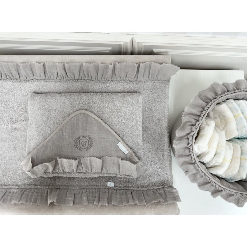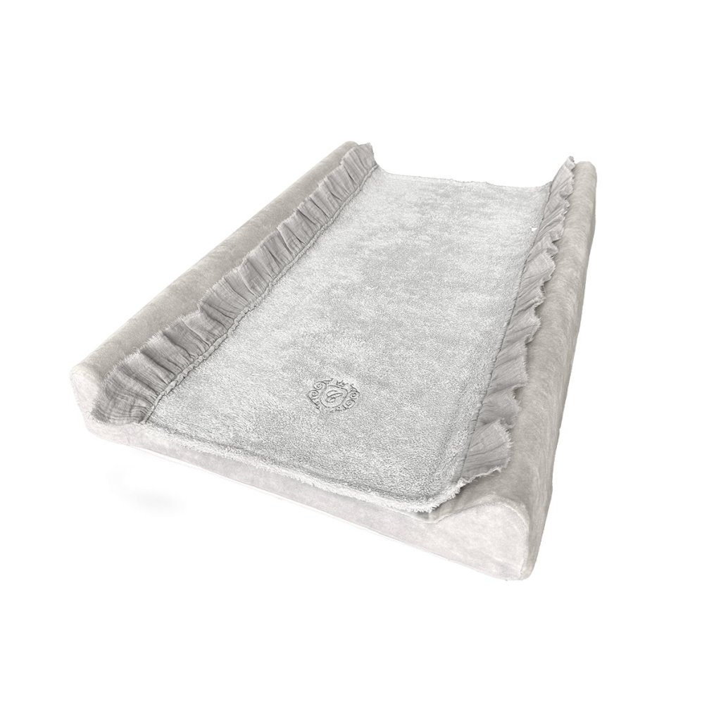 Vystužená elegantná prebaľovacia podložka mimoriadne pohodlná na prebaľovanie vášho bábätka vďaka vysoko kvalitným a jemným materiálom, pričom kombinuje funkčnosť s estetikou. Poduška je pokrytá snímateľným poťahom z béžovej látky s prídavnou podložkou z béžového froté, zdobená elegantnou výšivkou a mušelínovým volánom.