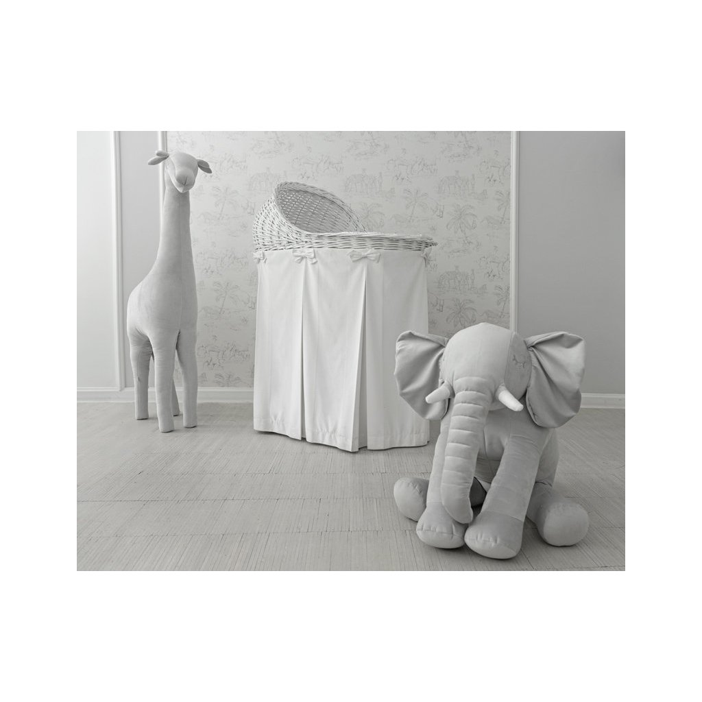 Krásny prútený kočík s bielymi a bledošedými prvkami. Je ručne vyrobený z najkvalitnejšieho prútia, lakovaného na bielo a je ozdobený bielym bavlneným riasením a bledošedou...