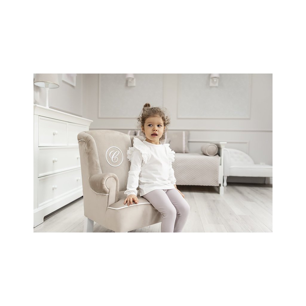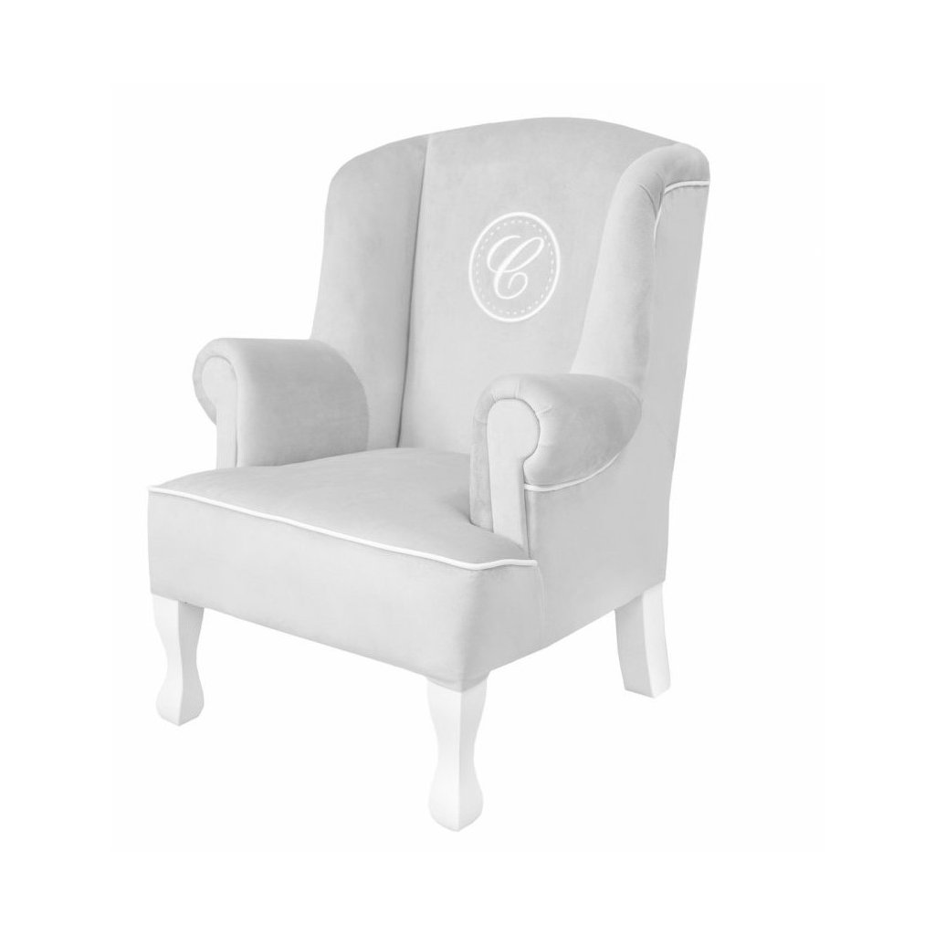 Elegantné, štýlové mini kreslo potiahnuté kvalitným umývateľným textilom v bledošedej farbe. Zdobené exkluzívnym písmenom „C“ (logom značky Caramella). Krásny, klasický nábytok, ktorý obohatí každú detskú izbu. Kreslo ma širokú plochu sedenia, čo zabezpečí mimoriadne pohodlné sedenie.
