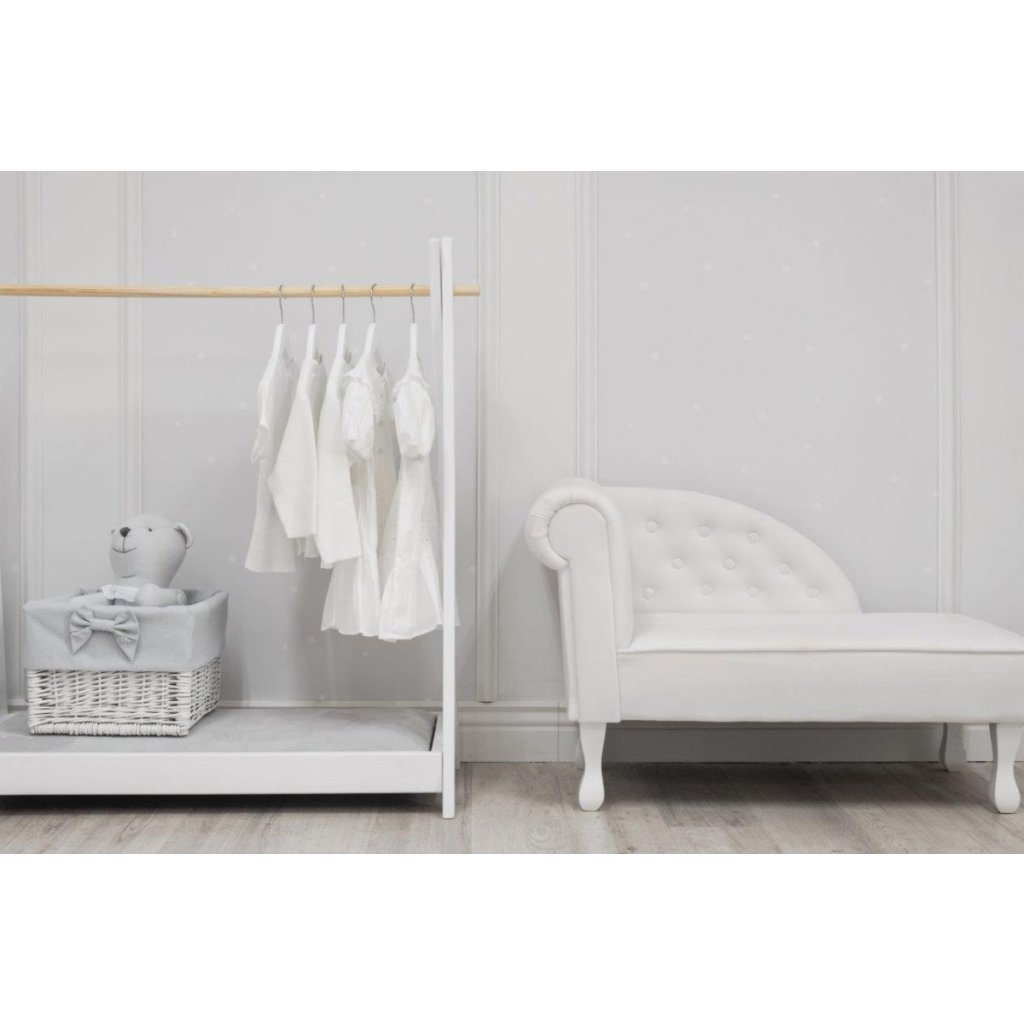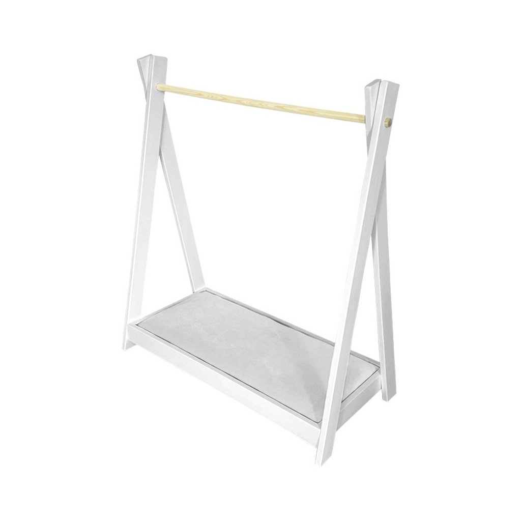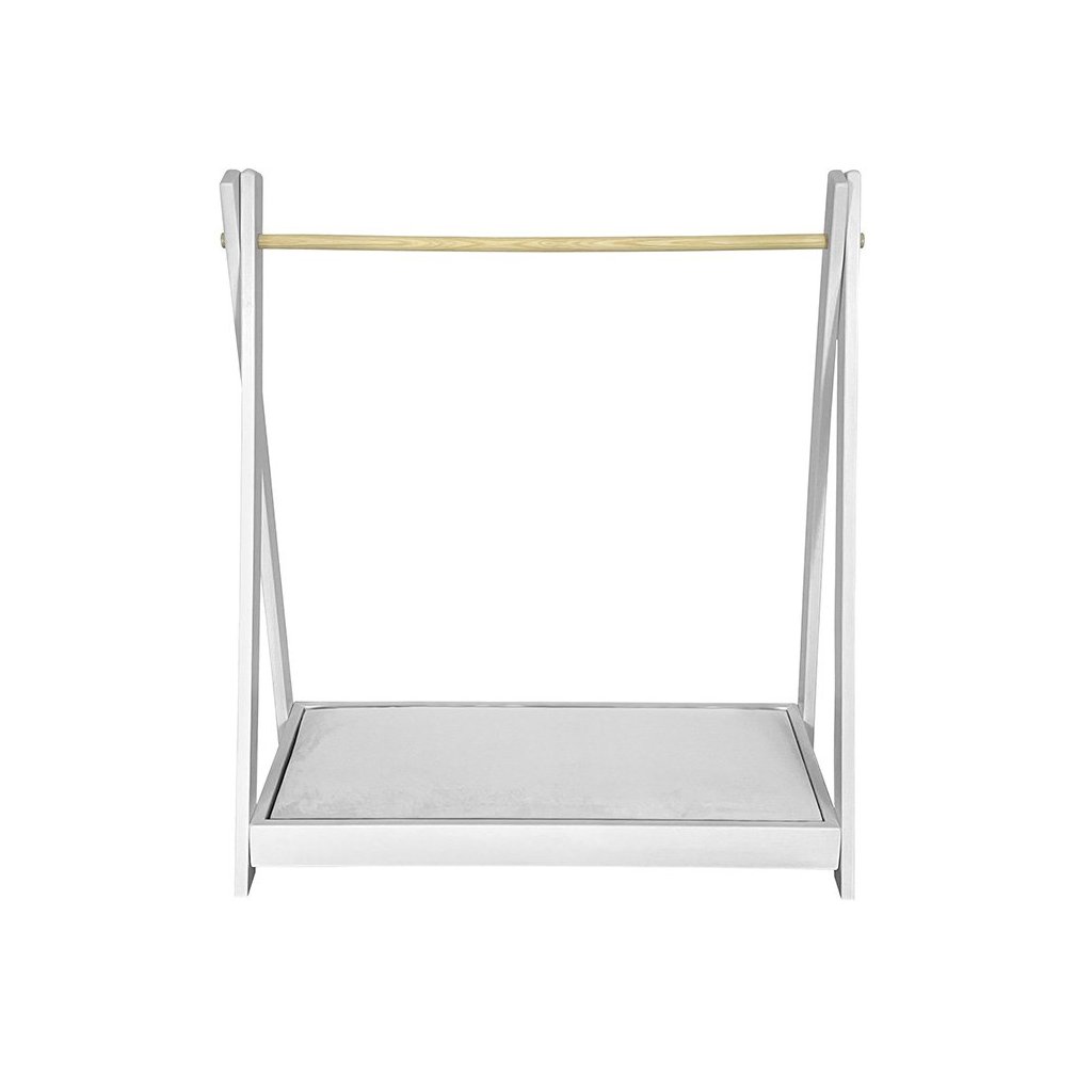 Rozkošný a funkčný drevený biely vešiak pre deti do detskej izby s čalúnenou policou v šedej farbe. Vešiak je skvelý na uloženie detského oblečenia a doplnkov. Vďaka tomuto šikovnému vešiaku môže dieťa upratať a organizovať odevy podľa farby, veľkosti a sezóny. Z hľadiska dizajnu sú pri tomto type produktu kľúčové krása a harmónia, elegancia ako aj ušľachtilé materiály. Farba konštrukcie je biela, tyč v prírodnej farbe a podušky sú dostupné v 3 farbách: béžová, šedá a ružová.