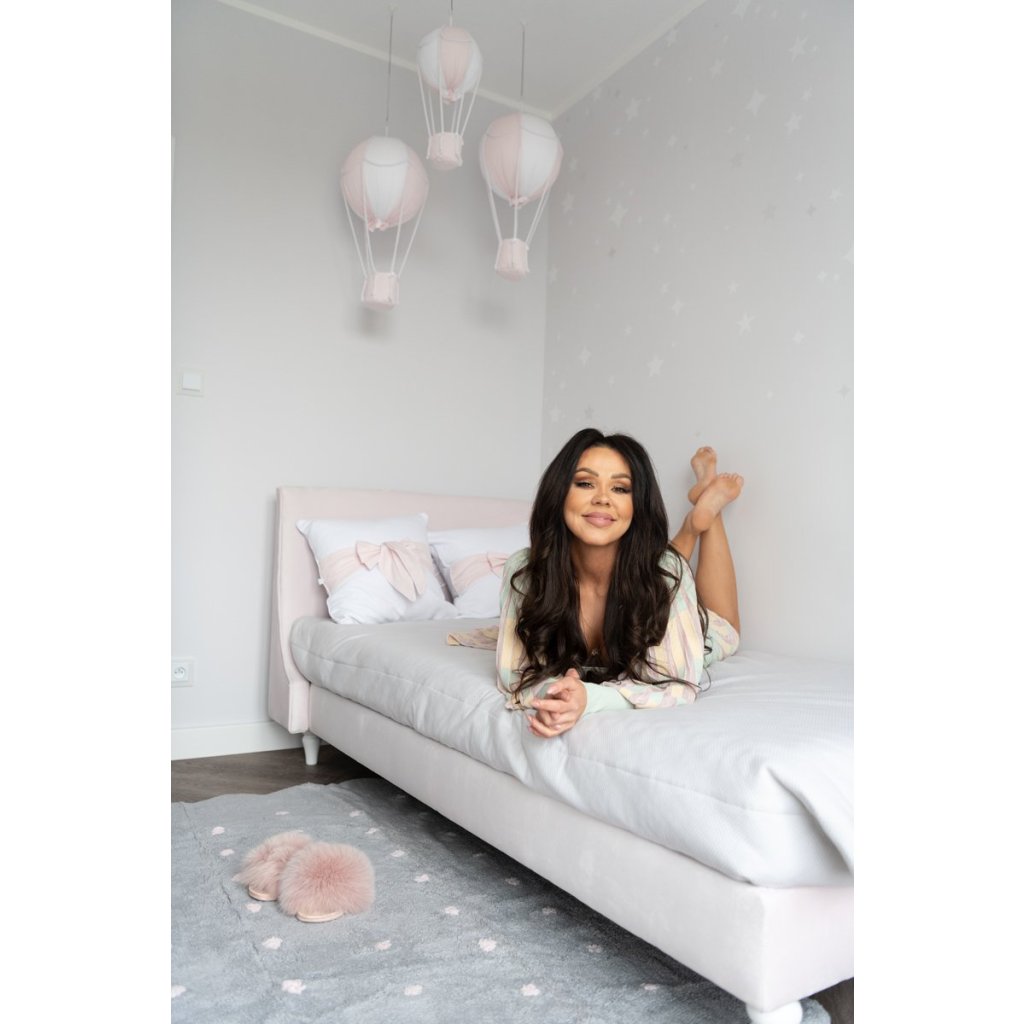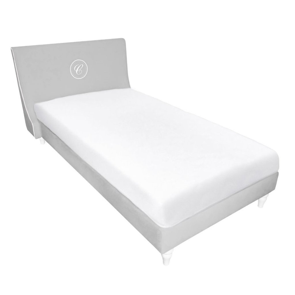 Elegantná detská posteľ s exkluzívnou výšivkou s písmenom „C“. Čelo postele a rám sú čalúnené kvalitnou umývateľnou textíliou v šedej farbe, vďaka čomu je nábytok ešte funkčnejší. Čelo postele má dekoratívnu stranu a konštrukcia na nohách dodáva posteli ľahký vzhľad. Posteľ si môžete objednať v rôznych veľkostiach a farbách.