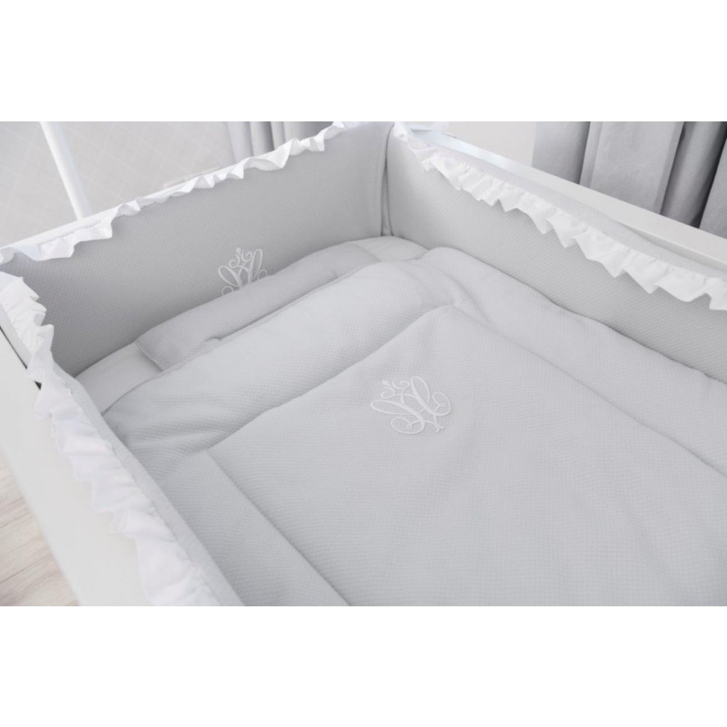 Exkluzívny prešívaný detský mantinel do postieľky v šedej farbe, zdobený bielym riasením.
