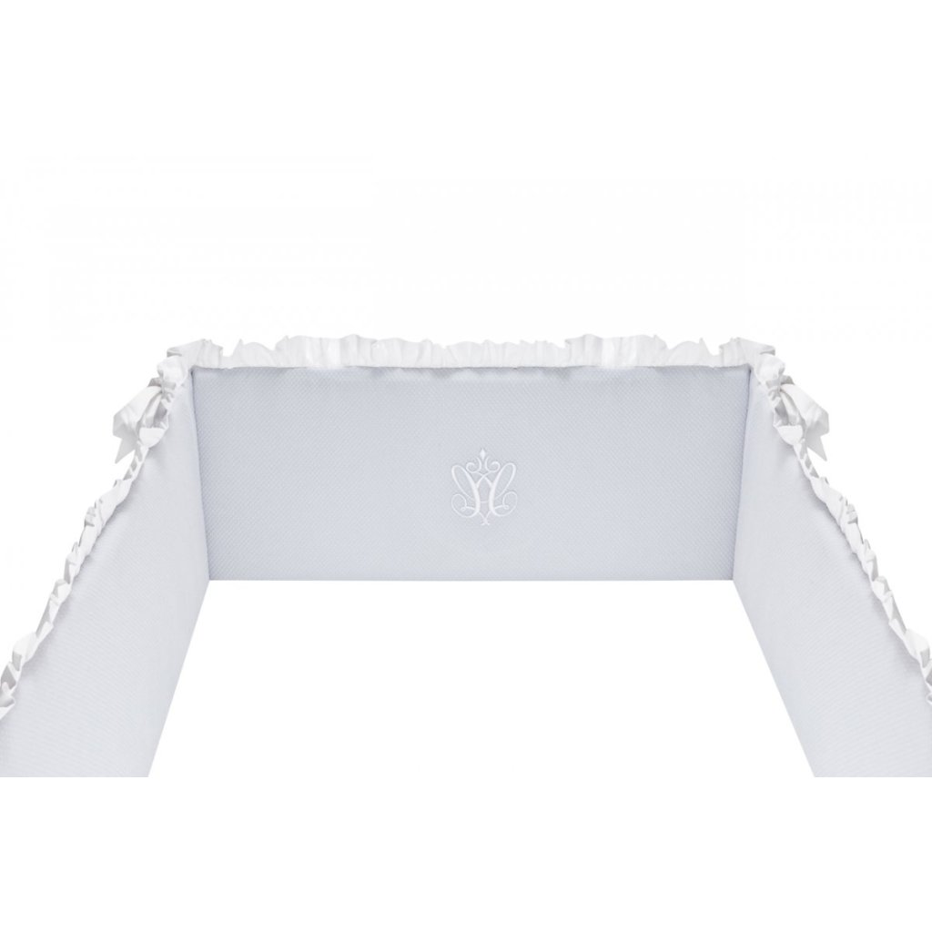 Exkluzívny prešívaný detský mantinel do postieľky v šedej farbe, zdobený bielym riasením. Mantinel je vyrobený z vysoko kvalitných tkanín. Vďaka výplni zo špeciálnej špongie je mantinel tuhý a dobre priľne k posteli. Krátke a široké šnúrky umožňujú jednoduché pripevnenie k priečkam. Prešívaný poťah sa zapína na zips, vďaka čomu je snímateľný. Poťah aj vnútorná výplň mantinela sú prateľné.