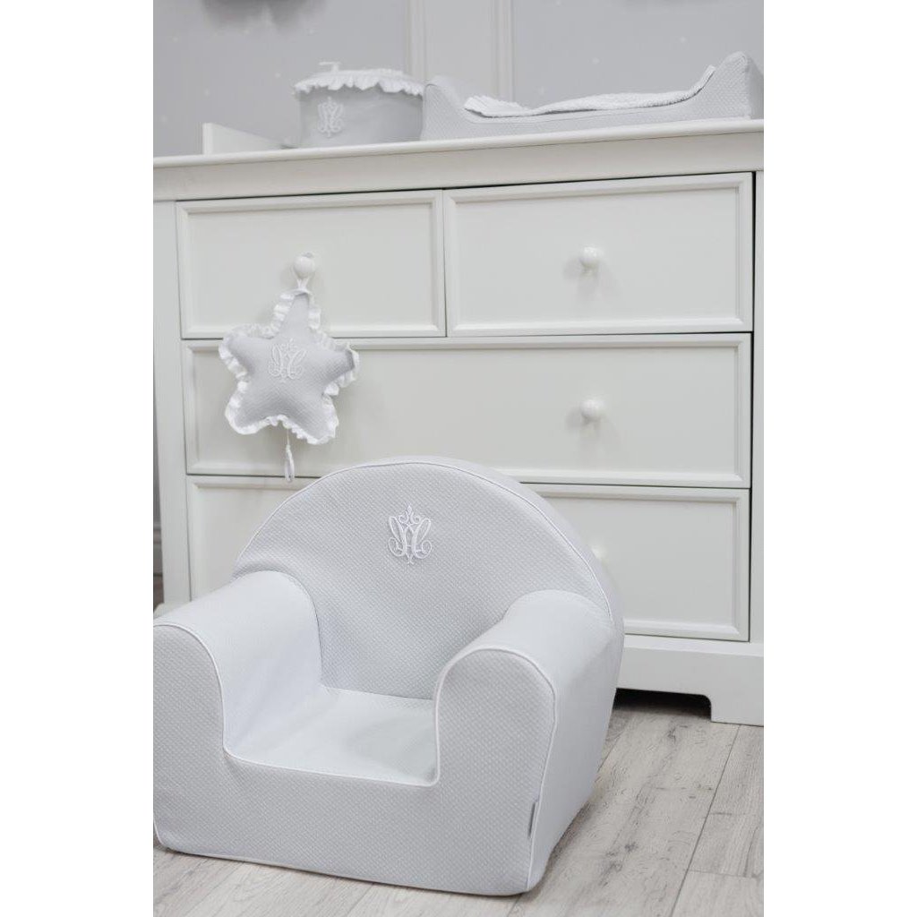 Malinká penová sedačka pre najmenšie deti v svetlosivej farbe zdobené bielym lemom a znakom spoločnosti. Bude to skvelé prvé sedadlo a bude krásnym doplnkom do izby. Poťah je snímateľný pre pranie.