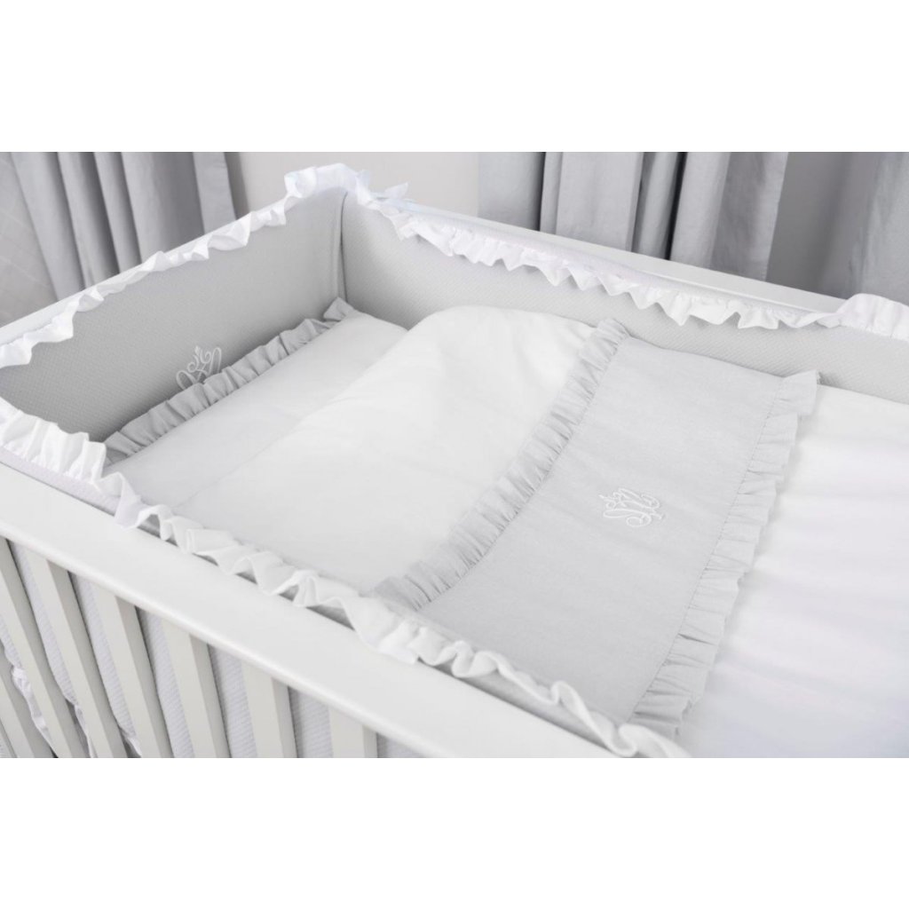 Exkluzívny prešívaný detský mantinel do postieľky v šedej farbe, zdobený bielym riasením.