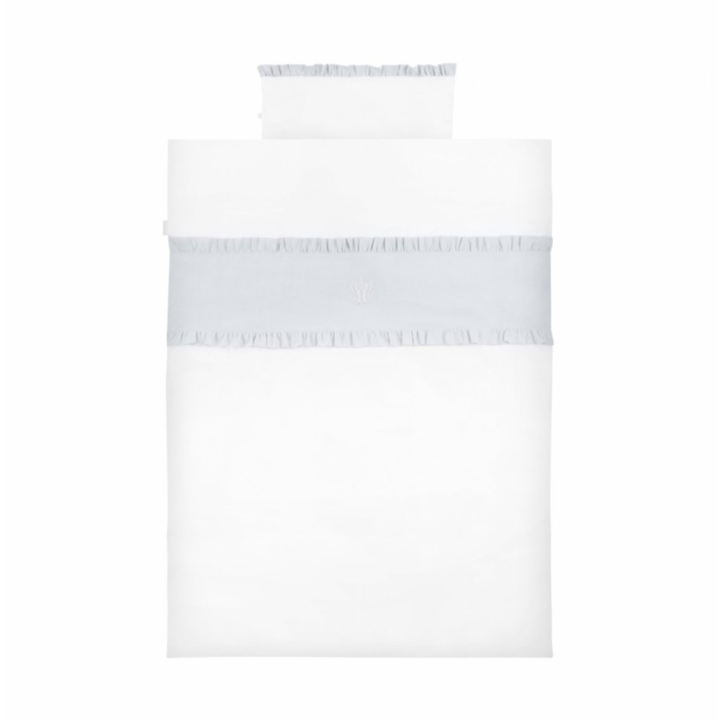 Krásne obliečky z bielej saténovej bavlny v kombinácii so svetlo šedou. Je ozdobený elegantným znakom a rozkošným volánom.