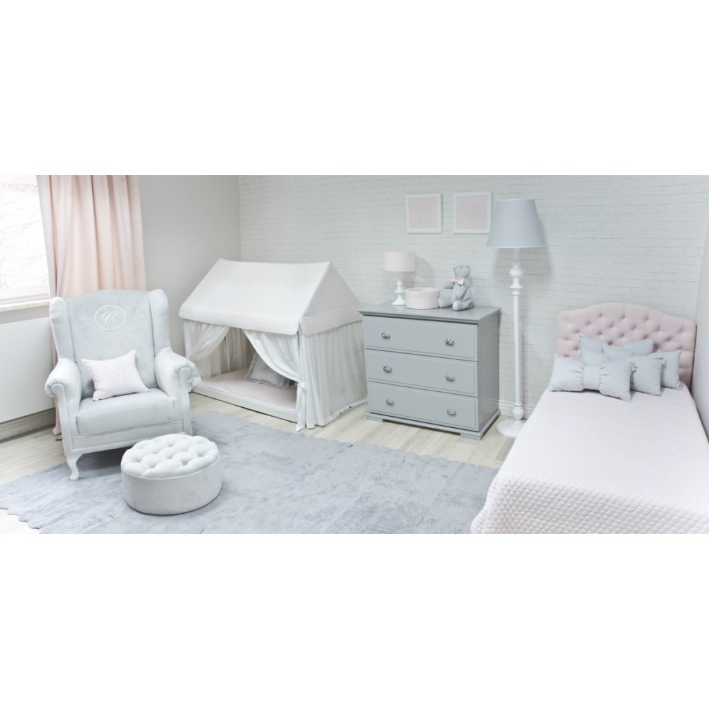 Elegantné prešívané puff kresielko v štýle Chesterfield vyrobené z kvalitného prateľného textilu. Krásny kus nábytku do detskej izby, spálne alebo obývacej izby.