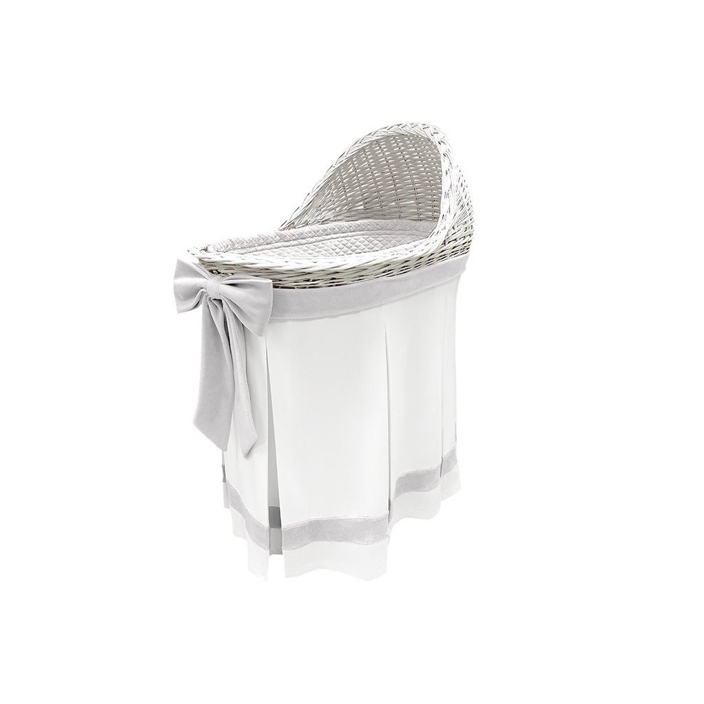 Veľmi okúzľujúca kolíska pre novorodenca, vyrobený z prírodného ručne tkaného prútia v bielej farbe. Kolíska je na kolieskach, vďaka čomu ju môžete jednoducho presúvať.  Originálna alternatíva k tradičnej postieľke v prvých mesiacoch života dieťaťa. Rám postieľky je zdobený krásnou sukňou z materiálu v bielej farbe so šedým prúžkom a mašličkou. Sukňa je zdobená riasením a mašličkami na suchý zips, ktoré vytvárajú veľmi jemnú a estetickú kompozíciu. Vnútro postieľky je vyložené mäkkým velúrom, ktorý chráni dieťa pred úrazmi. V spodnej časti košíku je oválny matrac.