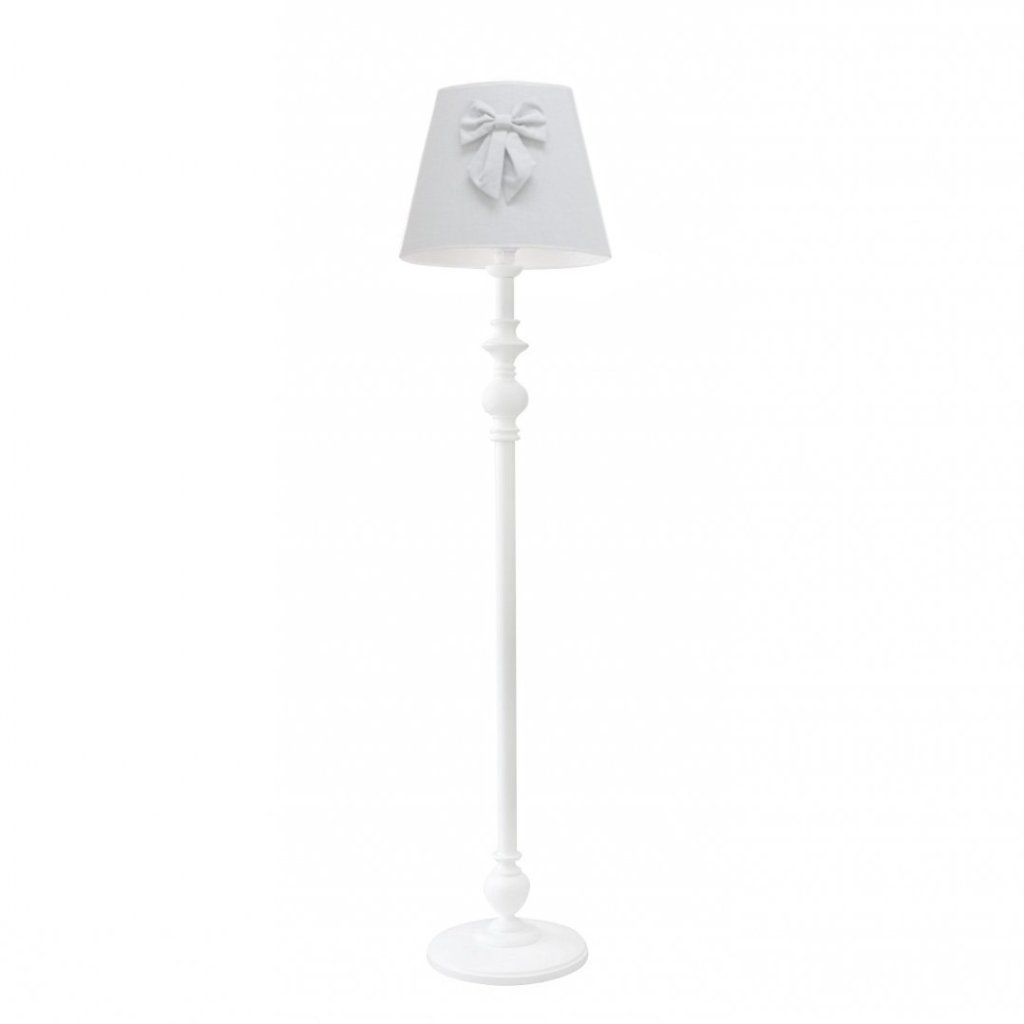 Krásny dizajn - stojacia lampa s ozdobnou nohou. Šedé tienidlo s tenkými prúžkami a krásnou ozdobnou mašľou. Veľká izbová lampa s elegantnou drevenou nohou sa bude hodiť do každej detskej izby.