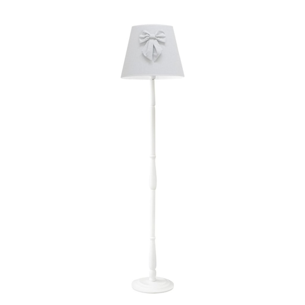 Krásny dizajn - stojacia lampa. Šedé tienidlo s tenkými prúžkami a krásnou ozdobnou mašľou.Veľká izbová lampa s elegantnou drevenou nohou sa bude hodiť do každej detskej izby.