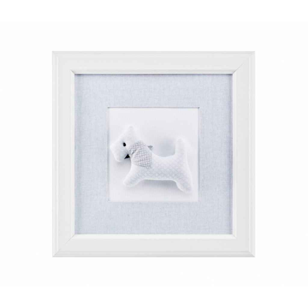 Najobľúbenejší detský miláčik - psík, v azúrovo-bielej farbe. Vnútorná časť obrazu je vyrobená z mäkkého textilu.