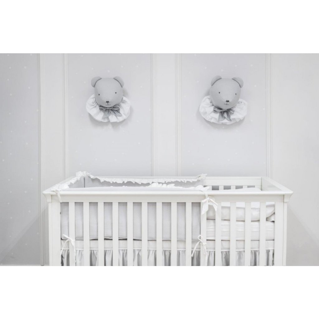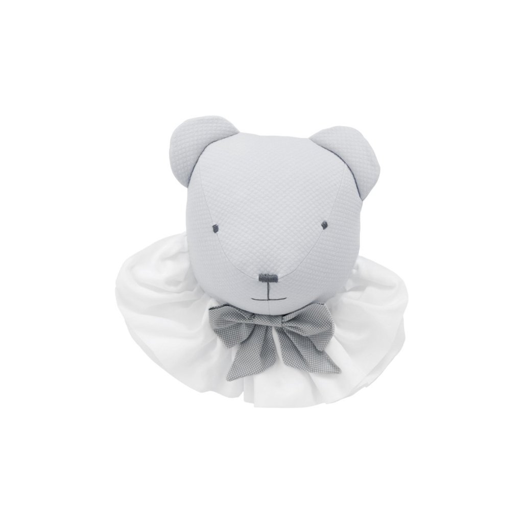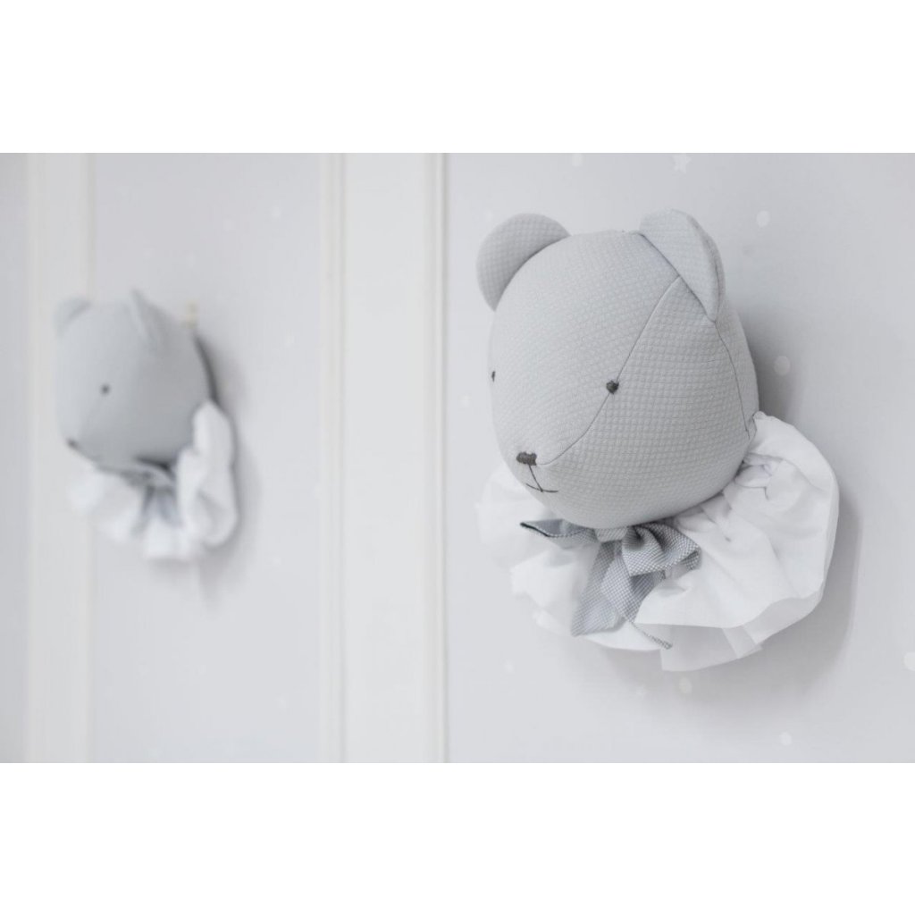 Krásna dekorácia na stenu do detskej izbičky - ručne vyrobená hlava medvedíka zdobená volánkom a mašličkou. Výrobok má pútka na zavesenie.