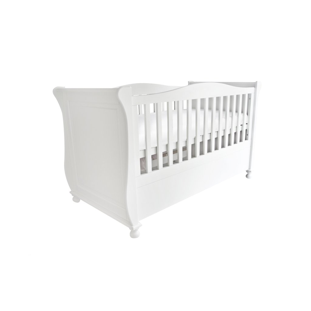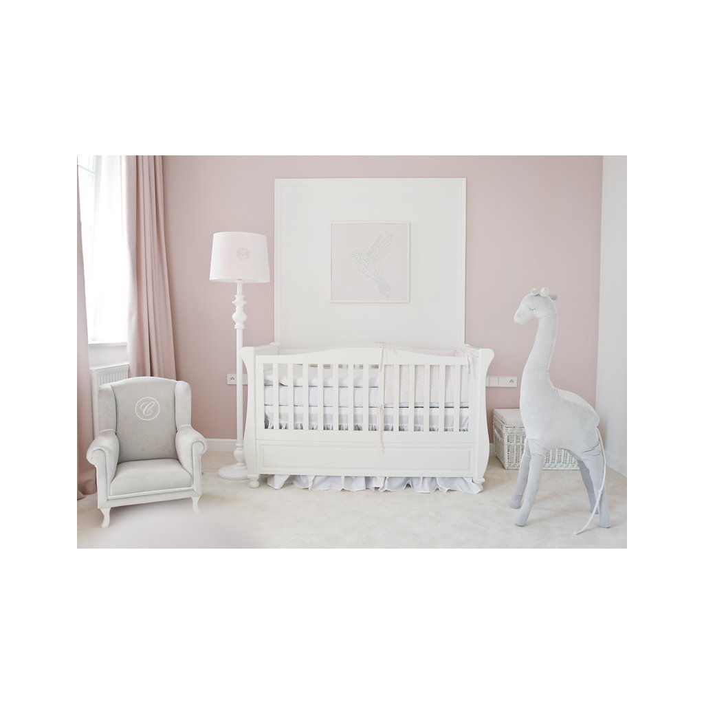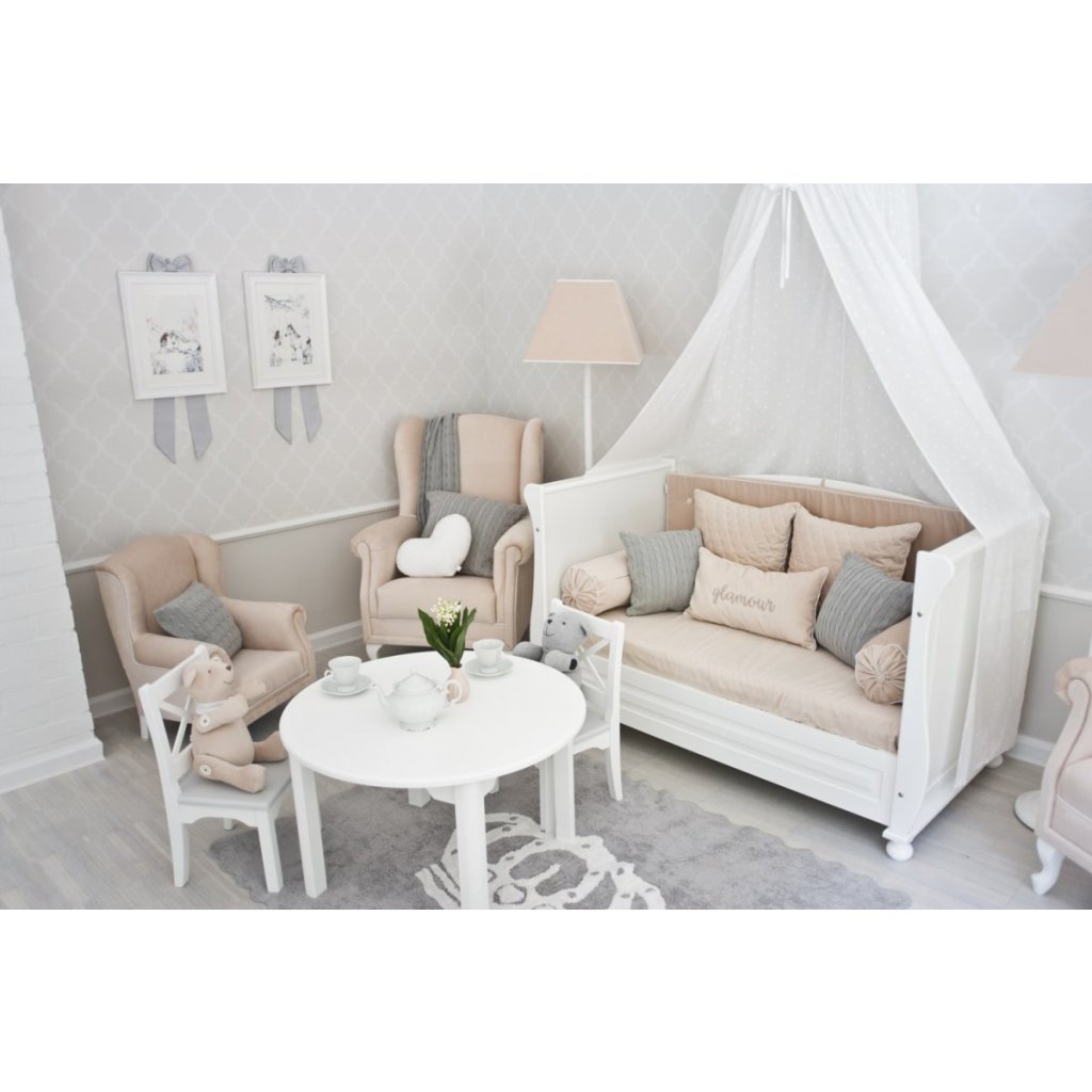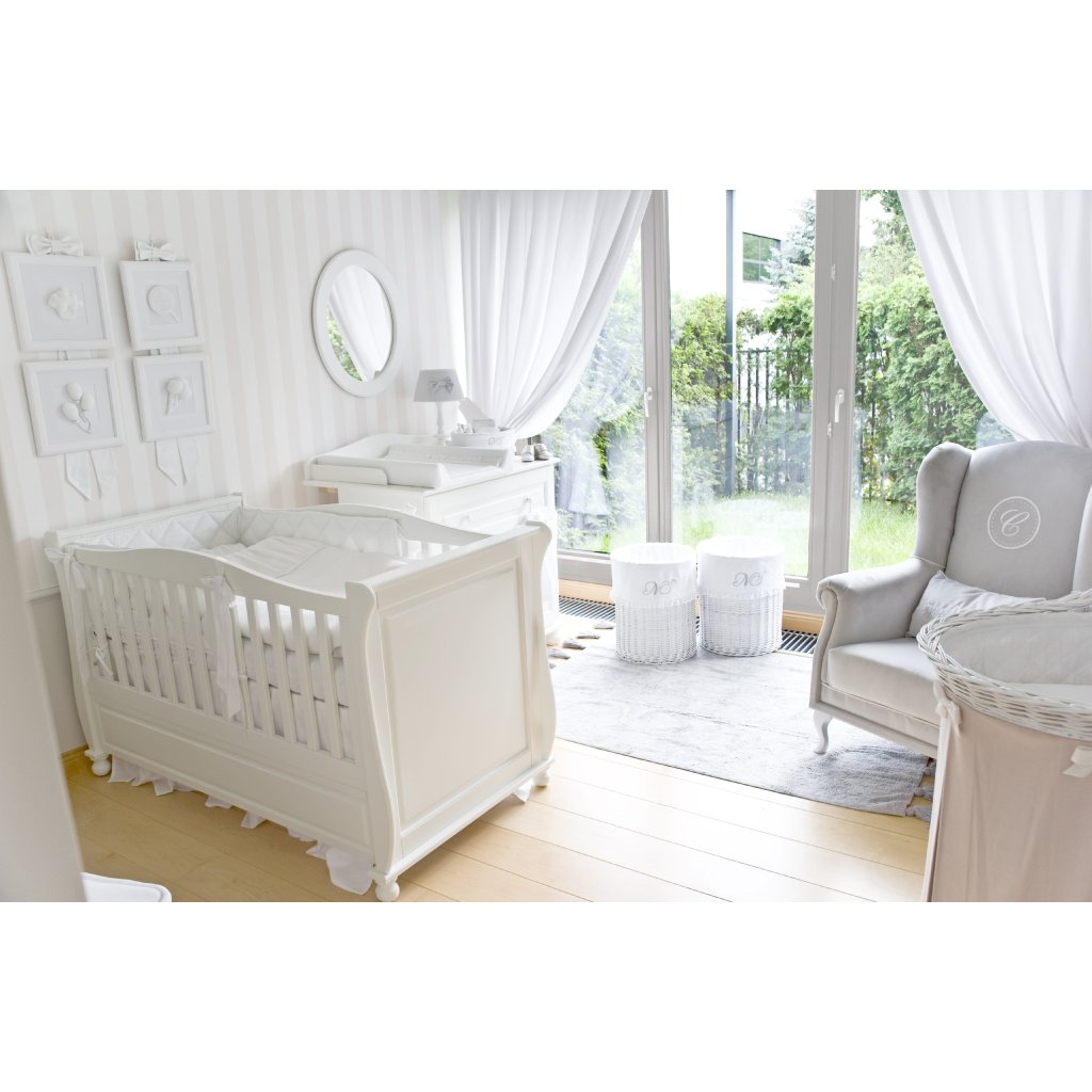 Luxusná romantická postieľka v bielej farbe. Táto postieľka bude pre vaše dieťa užitočná mnoho rokov. Na začiatku sa používa ako postieľka, neskôr sa môže zmeniť na posteľ pre staršie dieťa a potom na malú pohovku.