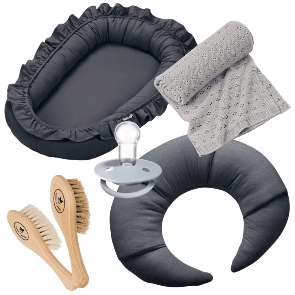SADA obsahuje: hniezdo, dojčiaci a tehotenský vankúš, detskú bambusovú deku, cumlík, relaxačnú kefu, vyčesávaciu kefu.