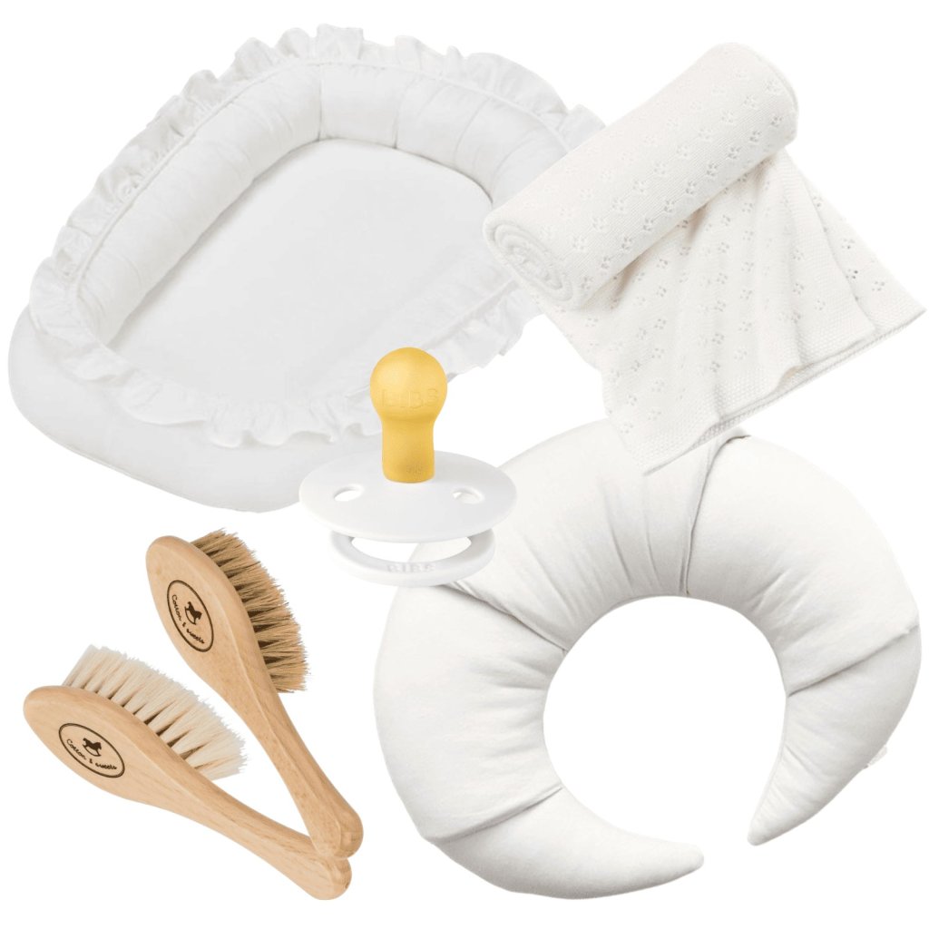 SADA obsahuje: hniezdo, dojčiaci a tehotenský vankúš, detskú bambusovú deku, cumlík, relaxačnú kefu, vyčesávaciu kefu.
