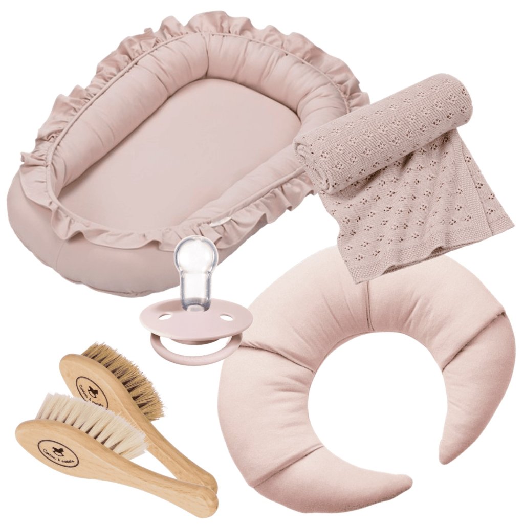 SADA obsahuje: hniezdo, dojčiaci a tehotenský vankúš, detskú bambusovú deku, cumlík, relaxačnú kefu, vyčesávaciu kefu.