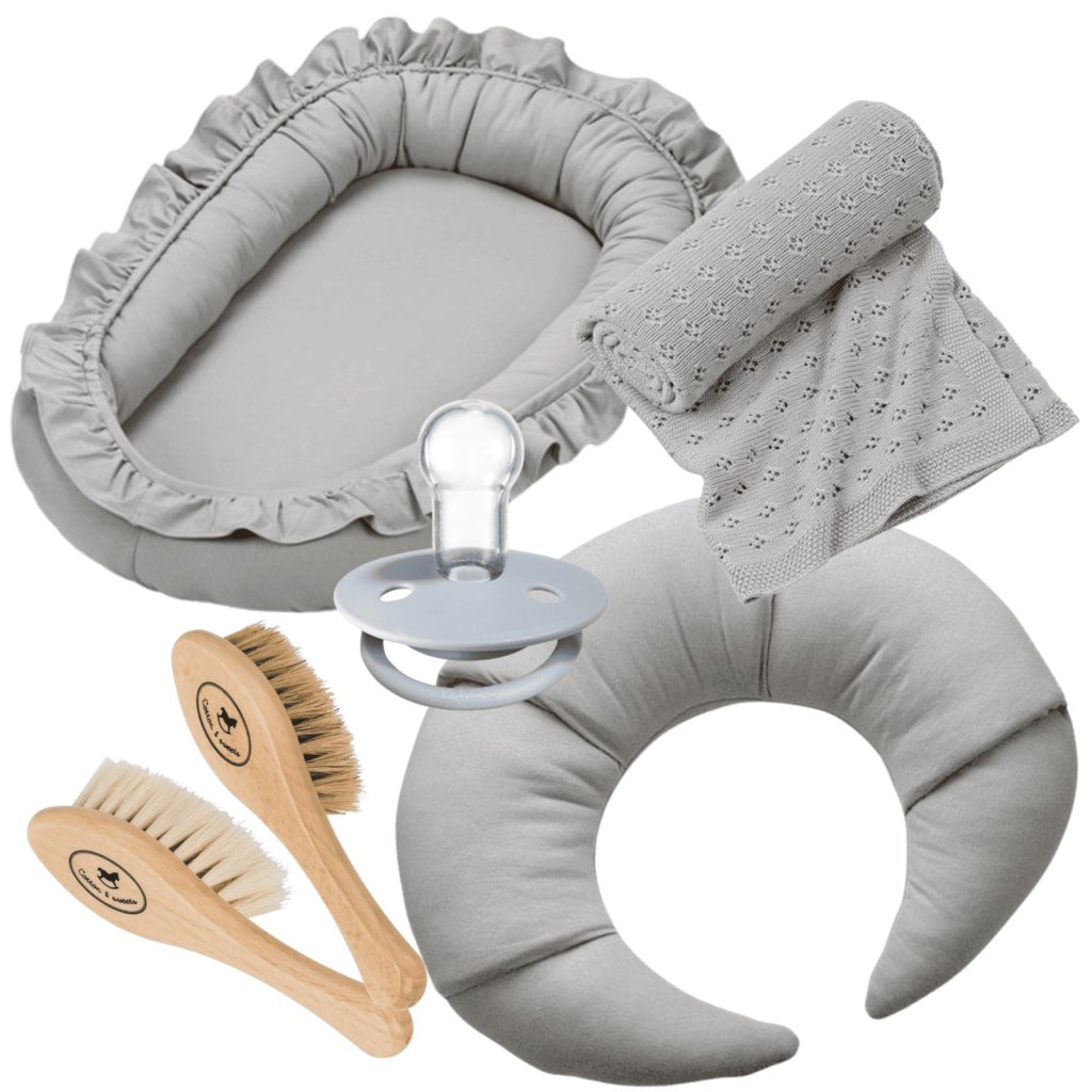 SADA obsahuje: hniezdo, dojčiaci a tehotenský vankúš, detskú bambusovú deku, cumlík, relaxačnú kefu, vyčesávaciu kefu.