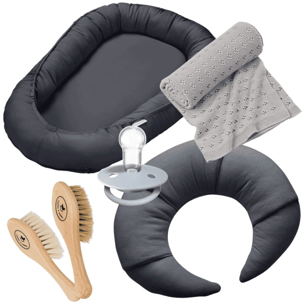 SADA obsahuje: hniezdo, dojčiaci a tehotenský vankúš, detskú bambusovú deku, cumlík, relaxačnú kefu, vyčesávaciu kefu.