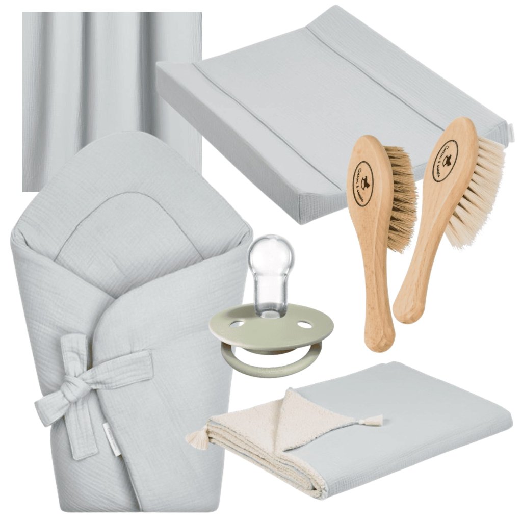 SADA obsahuje: zavinovačku, osušku, mušelínovú plienku, cumlík, relaxačnú kefu, vyčesávaciu kefu.