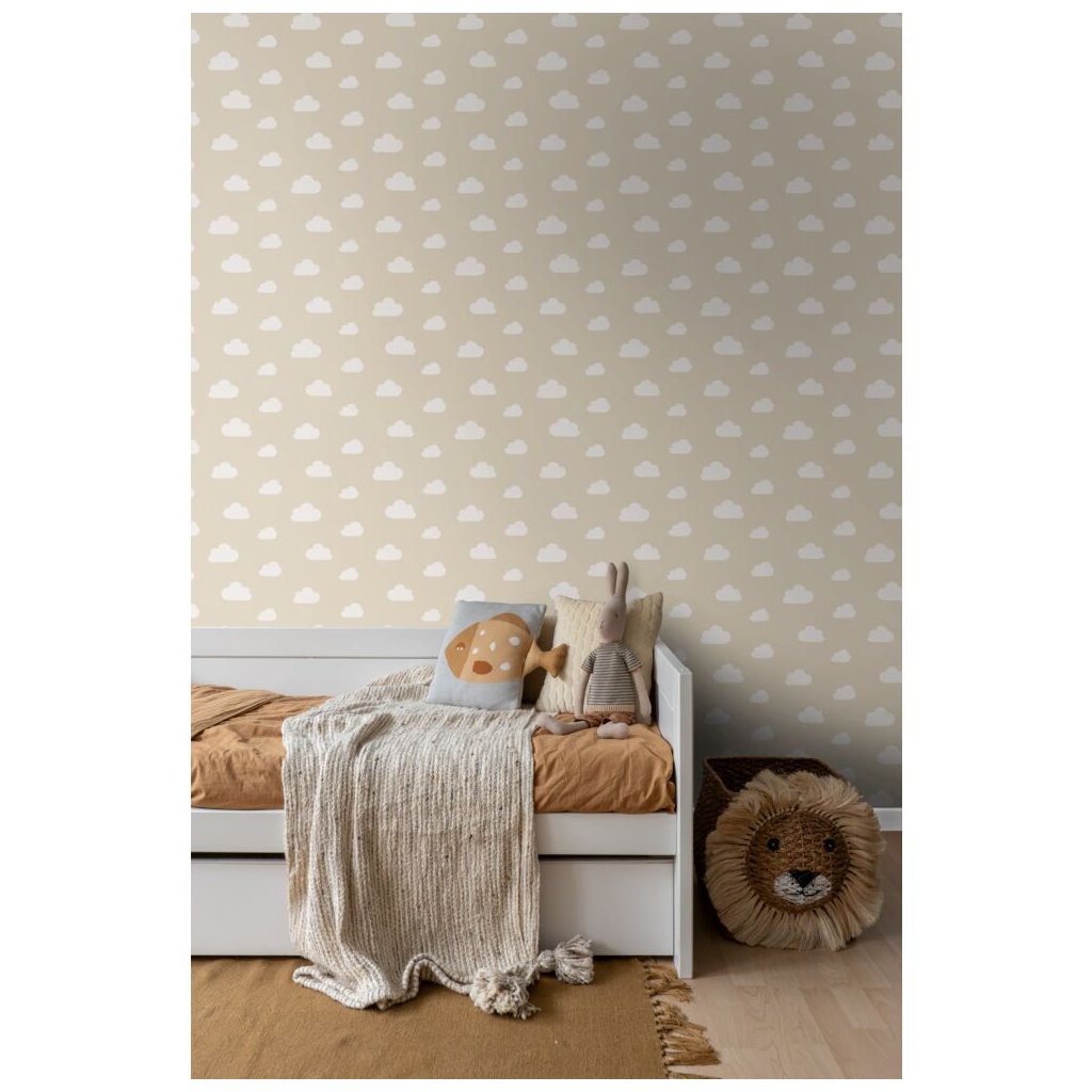 Hladká béžová vliesová tapeta na stenu, biele mráčiky.