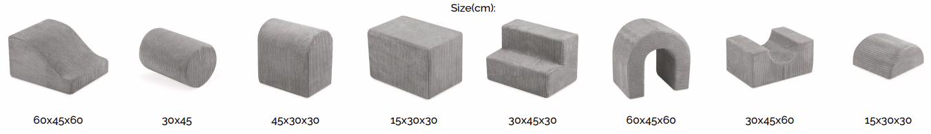 Každý rodič sníva o detskom ihrisku, ktoré je bezpečné, pohodlné a zároveň zaisťuje maximálnu zábavu. Teraz si môžete vytvoriť ihrisko vo svojom vlastnom dome! Naše rekreačné bloky nielen stimulujú detskú fantáziu, ale učia aj tvorivému mysleniu. Sada modulov môže slúžiť na zábavu, ale aj na cvičenie, na vytváranie prekážkových dráh alebo priestorových štruktúr. Jednotlivé prvky je možné použiť ako taštičky alebo sedáky.