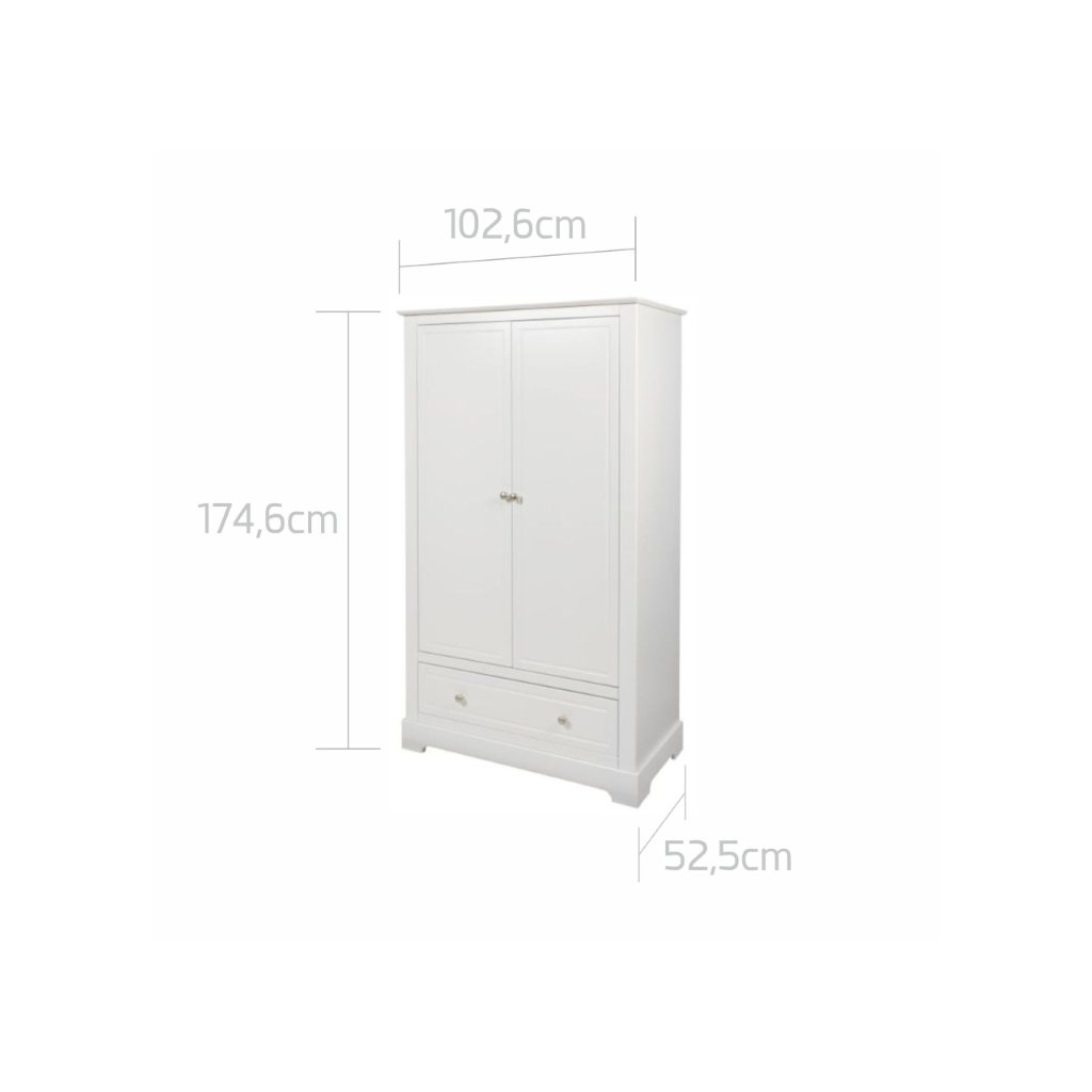 2-dverová šatníková skriňa Elegance disponuje 1 pevnou policou v celej šírke spolu so závesnou tyčou, 1 nastaviteľnou policou v celej šírke na uloženie všetkých detských potrieb a 1 priestrannou zásuvkou. Kolekcia Marylou je vyrobená z vysokokvalitnej MDF dosky natretá bielou nezávadnou farbou. Na zvýšenie bezpečnosti a pohodlia pri používaní sa používajú bezpečné a spoľahlivé vodiace koľajnice s funkciou samozatvárania. Rozmery : Š-102,6 x H-52,5 x V-174,6 cm
