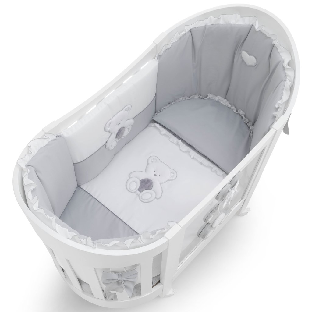 Kompletný 5 dielny set obsahuje: mantinel, paplónik + návliečku, návliečku na vankúšik a bavlnenú bielu plachtu na matrac. Textilné sety do postieľky od talianského výrobcu Italbaby sú vysoko kvalitné z veľmi príjemného materiálu zamerané na precízne spracovanie každého detailu. Produkty značky Italbaby sú bezpečné, certifikované a vyrábajú sa podľa bezpečnostných noriem priamo v Taliansku.