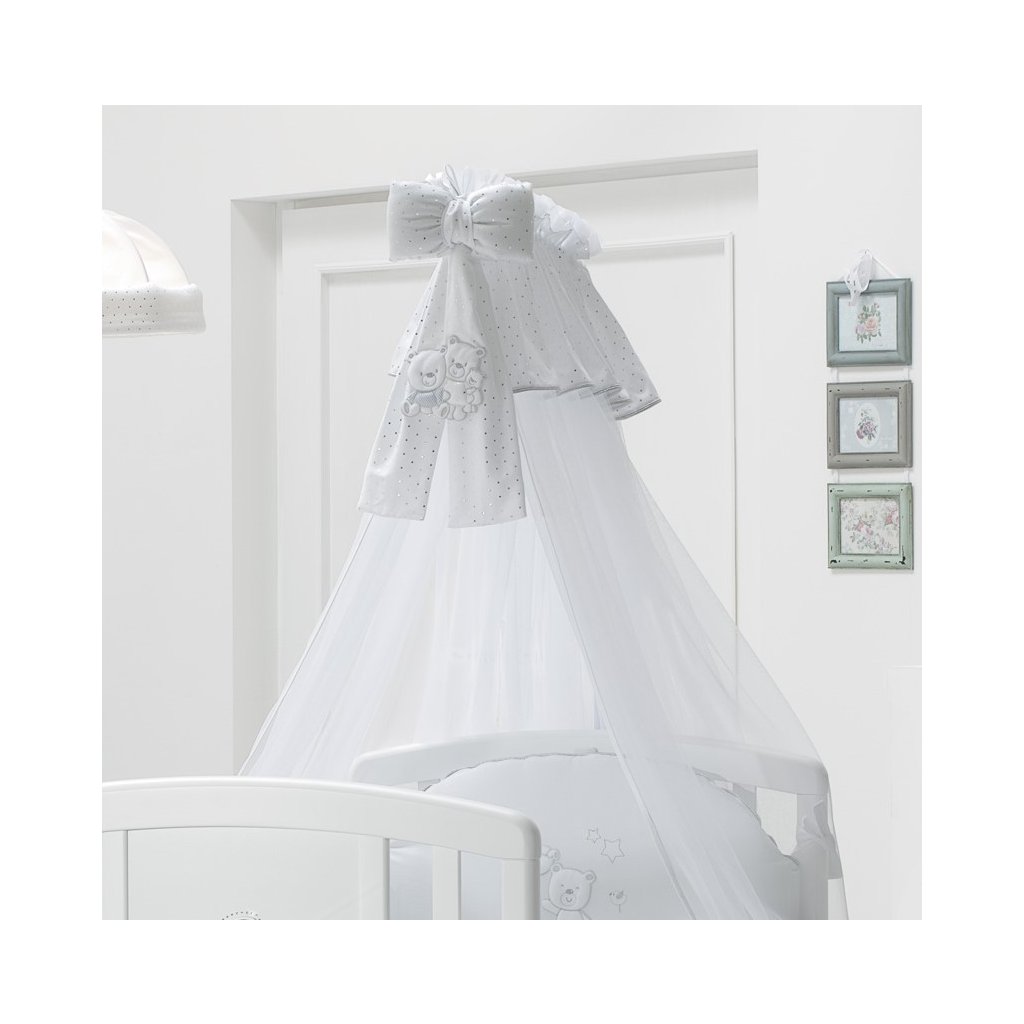 Elegantný tylový baldachýn s držiakom s rýchlo upínacím systémom na detskú postieľku. Baldachýn je elegantný doplnok, vďaka ktorému bude detská postieľka útulnejšia a dieťa sa bude cítiť bezpečnejšie. Baldachýn chráni dieťa pred prievanom, muchami a komármi.