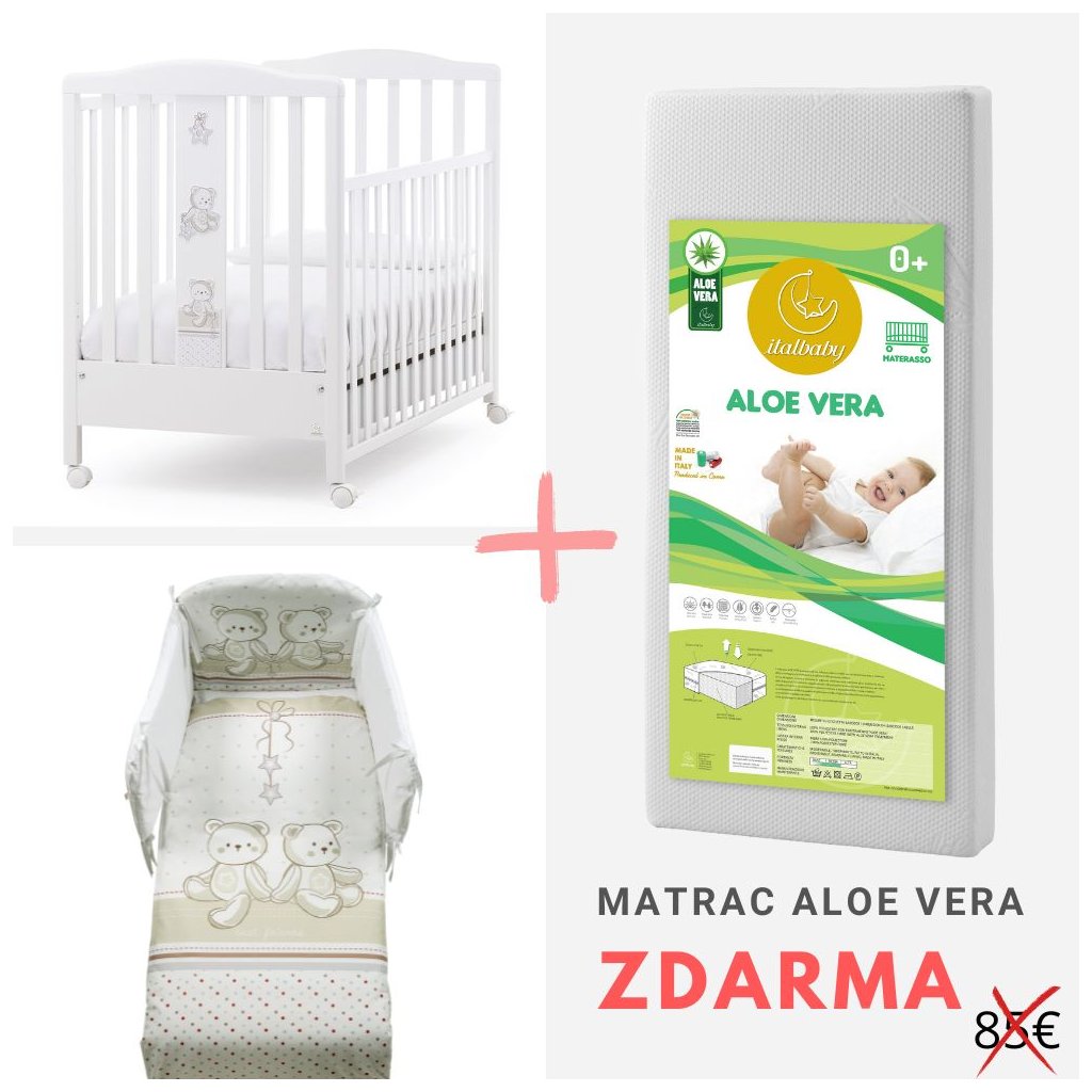 Italbaby detská postieľka so spúšťacím bokom Amici s komplet výbavou biela/béžová + matrac ZDARMA