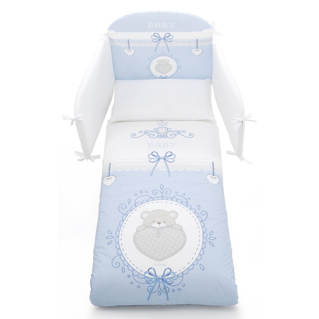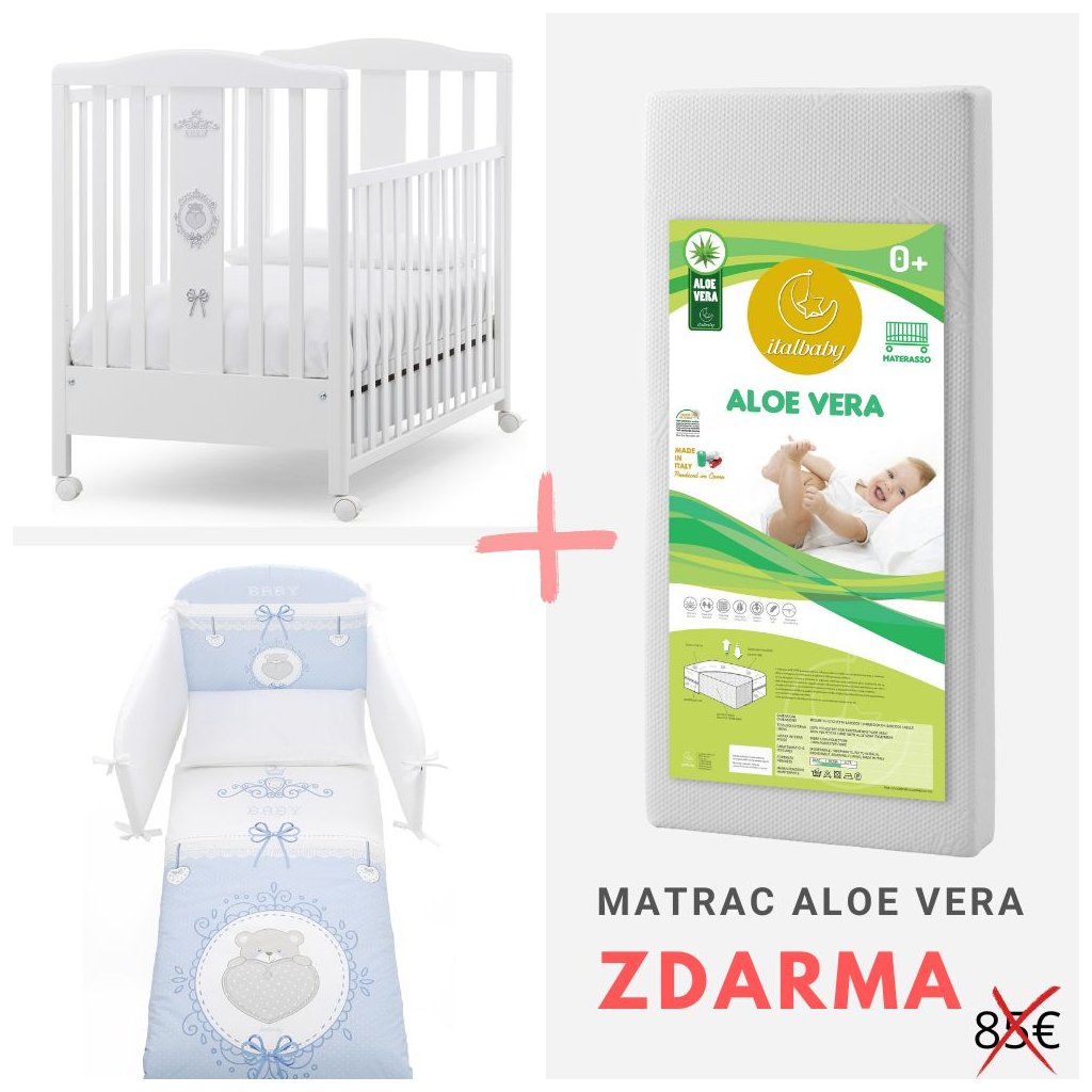 Italbaby detská postieľka so spúšťacím bokom Baby Chic s komplet výbavou biela/modrá + matrac ZDARMA