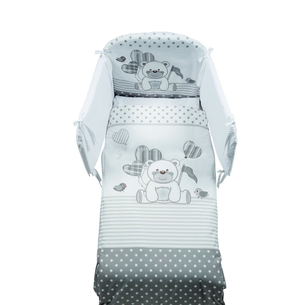 Kompletný 5 dielny set obsahuje: mantinel, paplónik + návliečku, plachtu na matrac a návliečku na vankúšik. 100% bavlna, vyrobené v Taliansku.