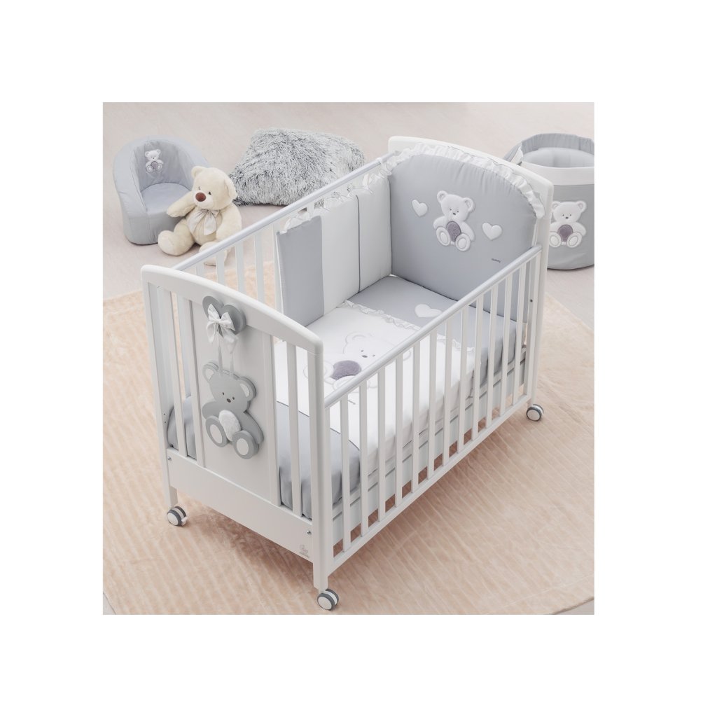 Spolu s doplnkami z kolekciePeluche šedávytvoríte skutočné rozprávkové prostrediepre váš malý poklad. K postieľke si môžete doplniť mantinel, perinku a vankúšik, prebaľovací pult, komodu, skriňu a celý rad textilných doplnkov z danej kolekcie. K postieľke si nezabudnite vybrať vhodnýmatrac s rozmerom 63x125cm, chránič matraca a antirefluxný vankúšik do postieľky. Postieľku ľahko zútulníte prateľným detským kobercom, ktorý si doma operiete v bežnej domácej práčke.