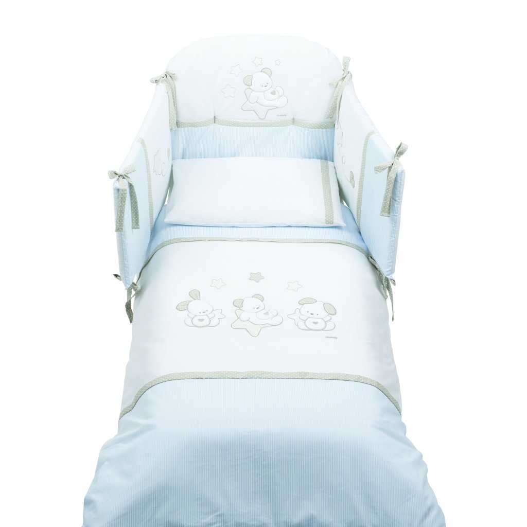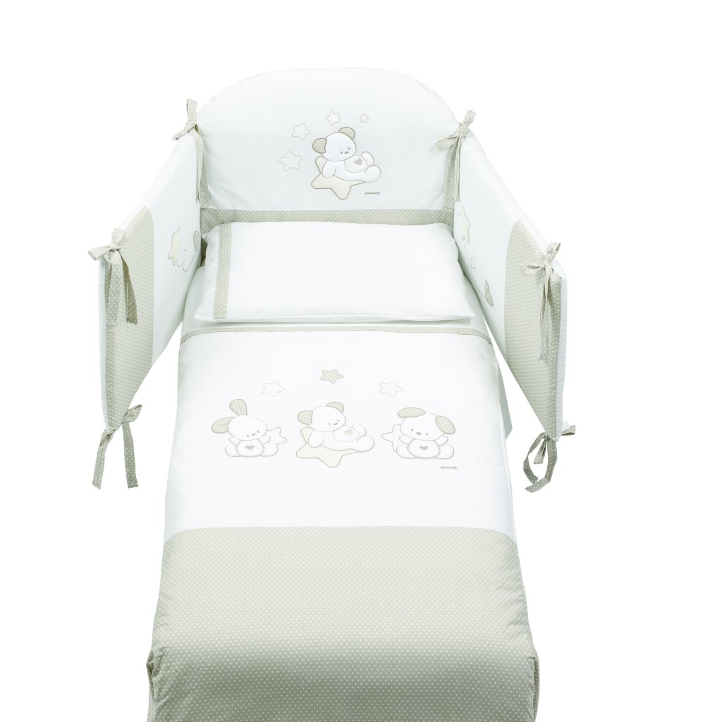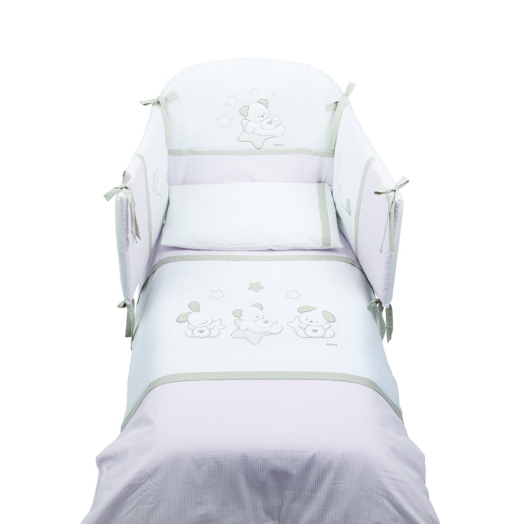 Kompletný 5 dielny set obsahuje: mantinel, paplónik + návliečku, plachtu na matrac a návliečku na vankúšik. 100% bavlna, vyrobené v Taliansku.