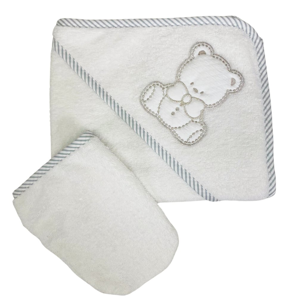 Bavlnená froté osuška pre novorodenca s kapucňou a žinkou v darčekovej krabičke. Vyrobené zo 100% certifikovanej bavlny v Taliansku. Ideálne ako darček.