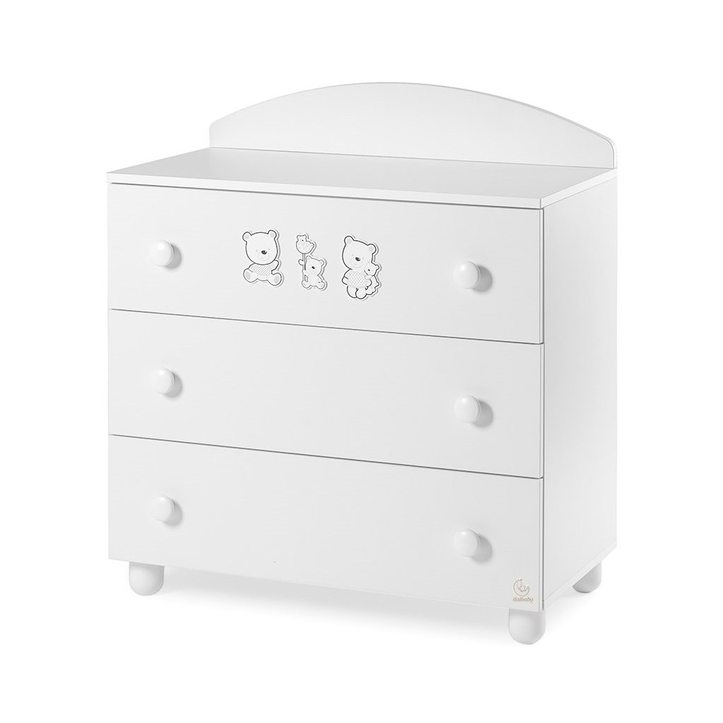 Praktická detská komoda s 3 priestrannými zásuvkami. Ku komode odporúčame dokúpiť prebaľovaciu podložku alebo externý drevený rám na PVC podložku.