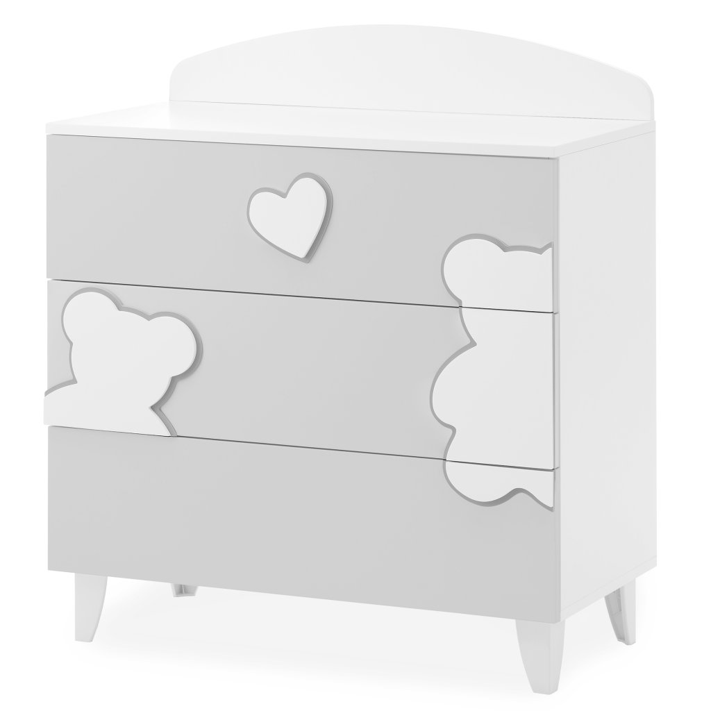 Detská komoda so zásuvkami zdobenými lakovaným reliéfom medvedíkov a srdiečka, do ktorých vložíte všetky potrebné veci Vášho bábätka. Užitočná komoda do detskej izby na odkladanie detských hračiek alebo oblečenia. Ku komode si môžete dokúpiť celý rad doplnkov z rovnakej kolekcie ako napríklad detskú postieľku, prebaľovací pult alebo detské obliečky a vytvoriť tak dieťaťu rozprávkovú detskú izbu.