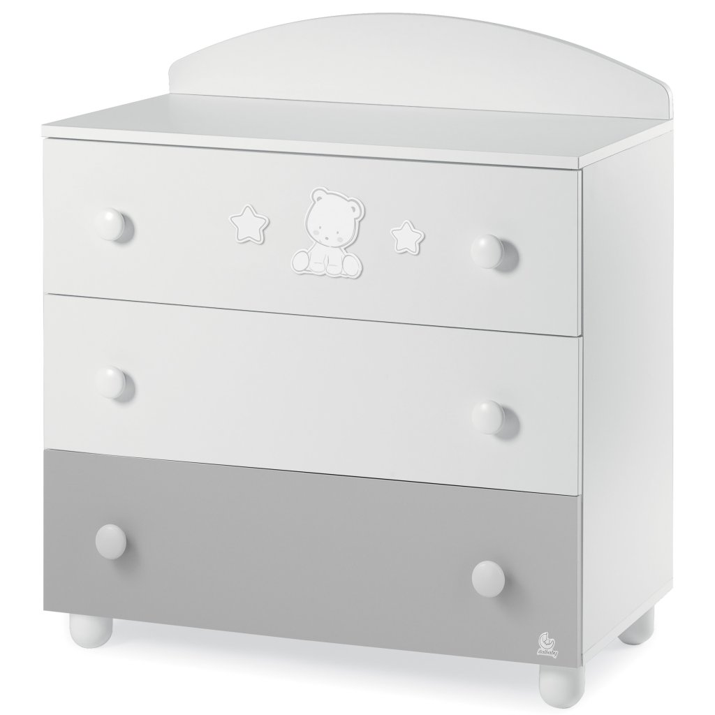 Praktická detská komoda s 3 priestrannými zásuvkami. Ku komode odporúčame dokúpiť prebaľovaciu podložku alebo externý drevený rám na PVC podložku.