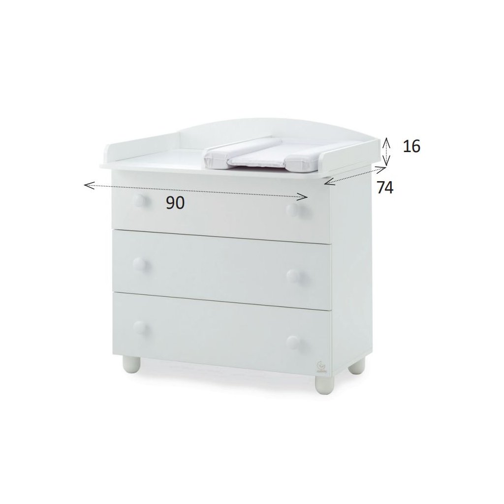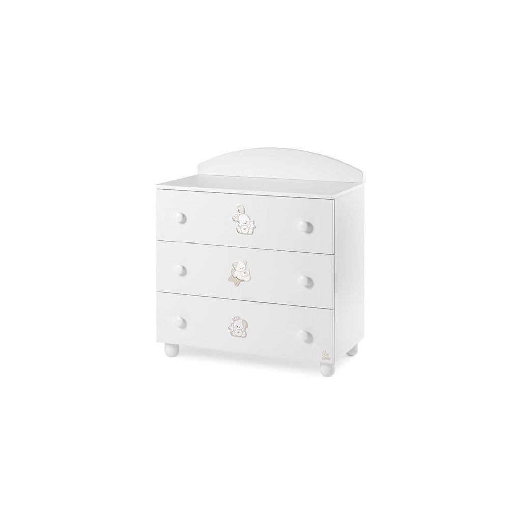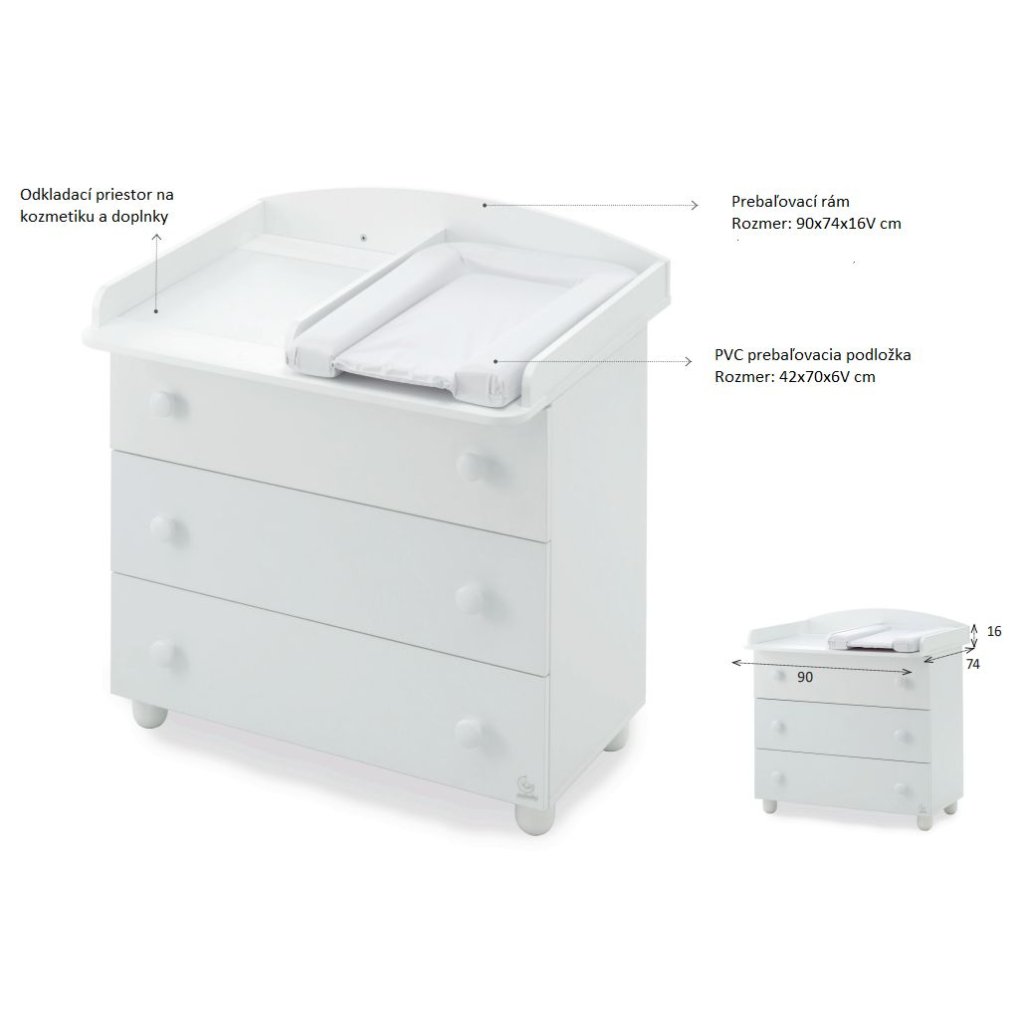 Praktická detská komoda s 3 priestrannými zásuvkami. Ku komode odporúčame dokúpiť prebaľovaciu podložku alebo externý drevený rám na PVC podložku.